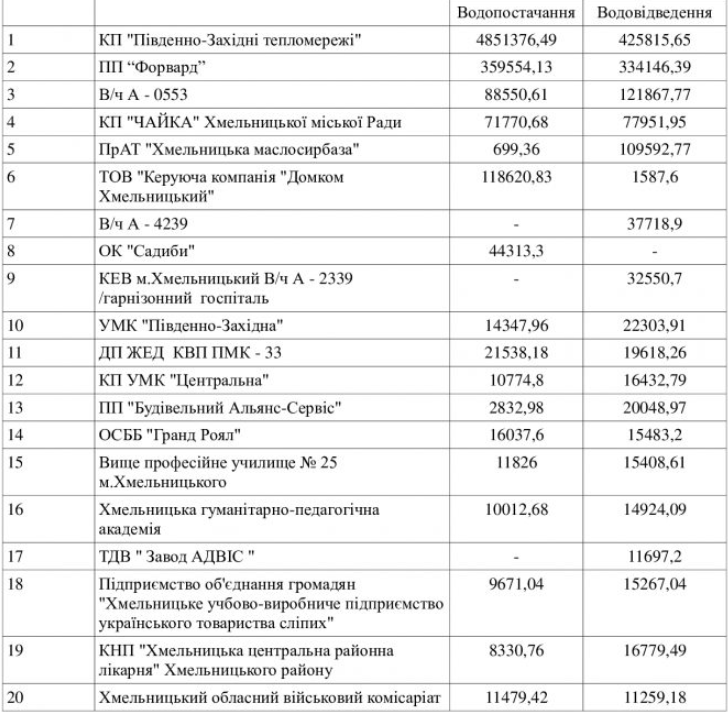 Які підприємства найбільше заборгували «Хмельницькводоканалу»: список