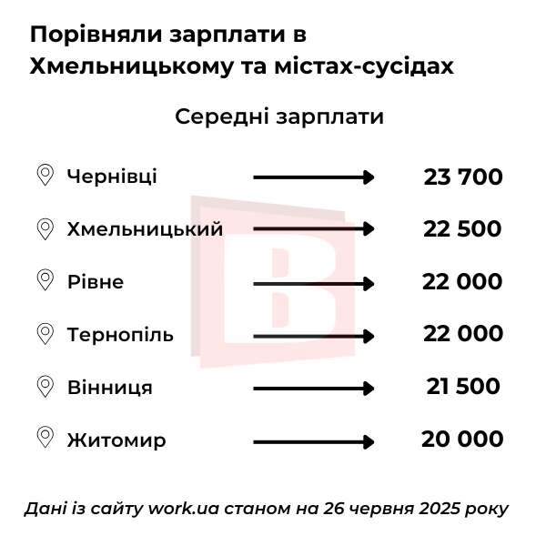 У порівнянні з сусідніми містами, Хмельницький займає друге місце за середньою зарплатою. Найвища – у Чернівцях, що складає 23 700. Найнижча – у Житомирі. Там середня заробітна плата становить 20 тисяч гривень.