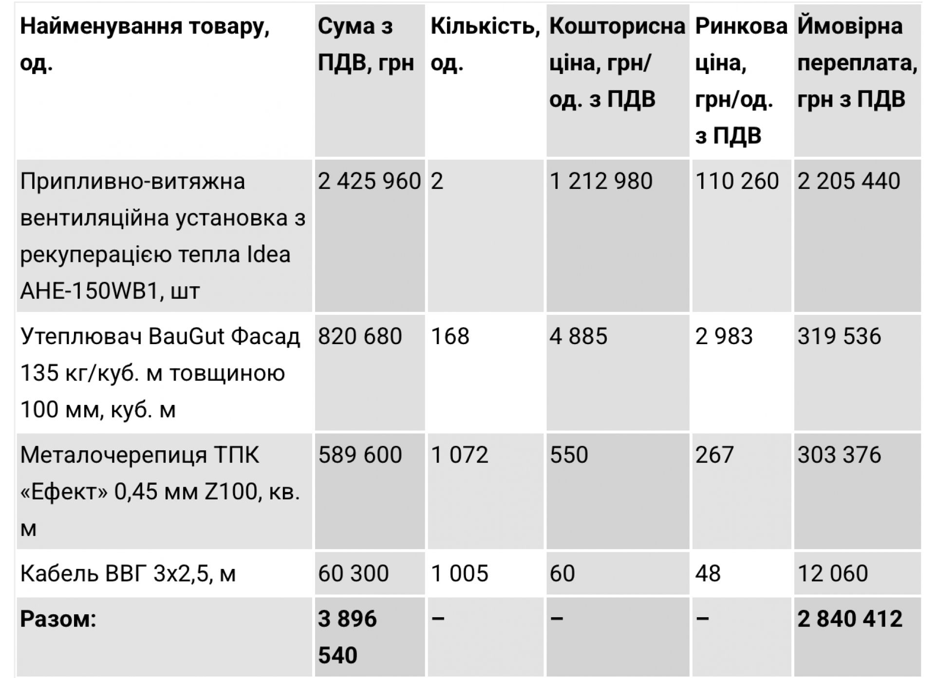 - вентиляційна установка Idea AHE-150WB1 закладена по 1,2 млн грн за штуку. Для порівняння: «Climagroup» та «Кондиціонери України» продають таке обладнання по 110 тисяч. Тобто вартість завищена приблизно в 11 разів;