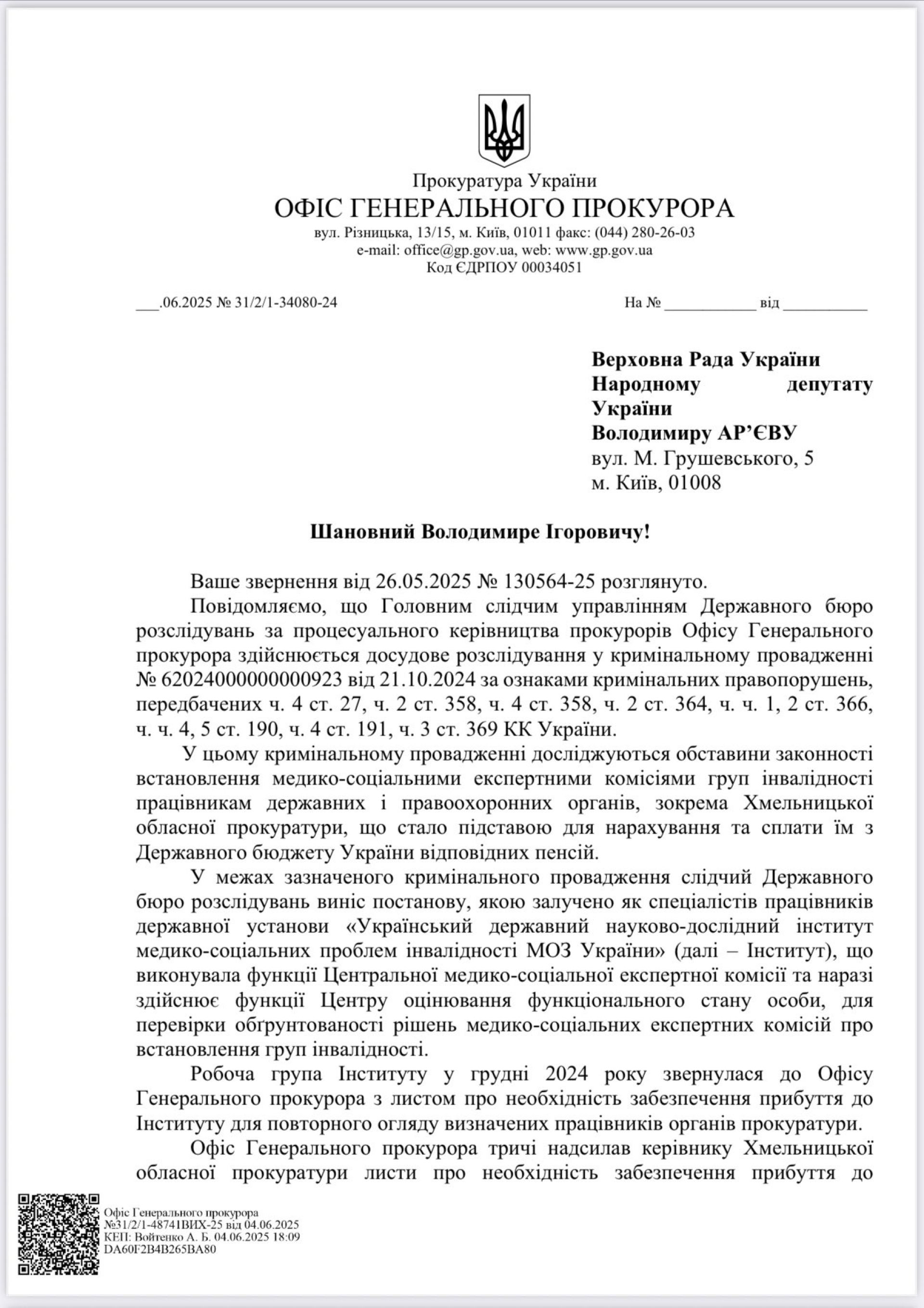 У Хмельницькій області 67 прокурорів оформили інвалідність на підозрілих підставах — і практично жоден із них не зіткнувся з реальними наслідками. Звільнено лише частину з них, а інші продовжують працювати. Про це повідомив народний депутат Володимир Ар’єв. Він отримав офіційну відповідь від Офісу генерального прокурора на свій депутатський запит щодо цієї справи.