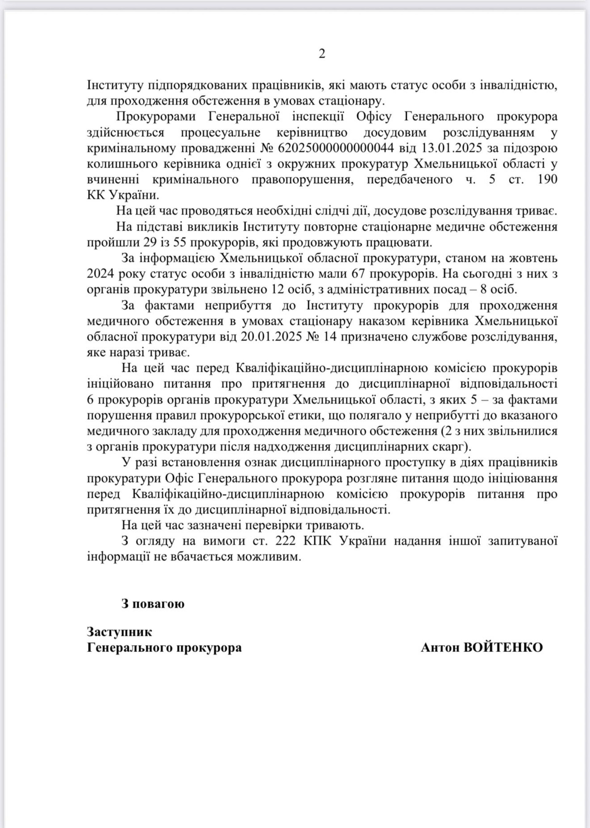 Перші результати перевірки показали, що насправді інвалідність мають не 51, як повідомляли раніше, а 67 прокурорів Хмельниччини. 80% з них отримали інвалідність ще до початку повномасштабного вторгнення.