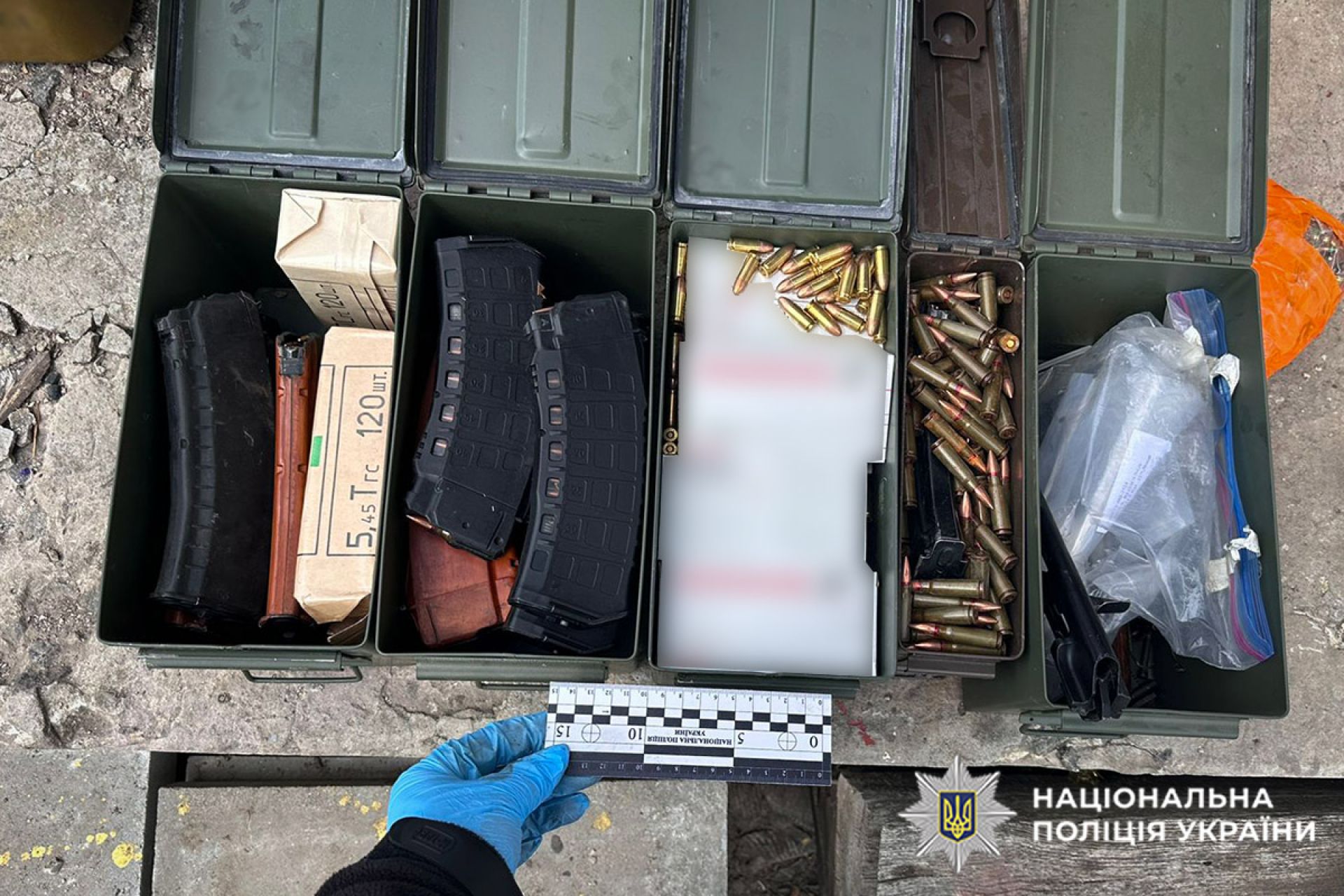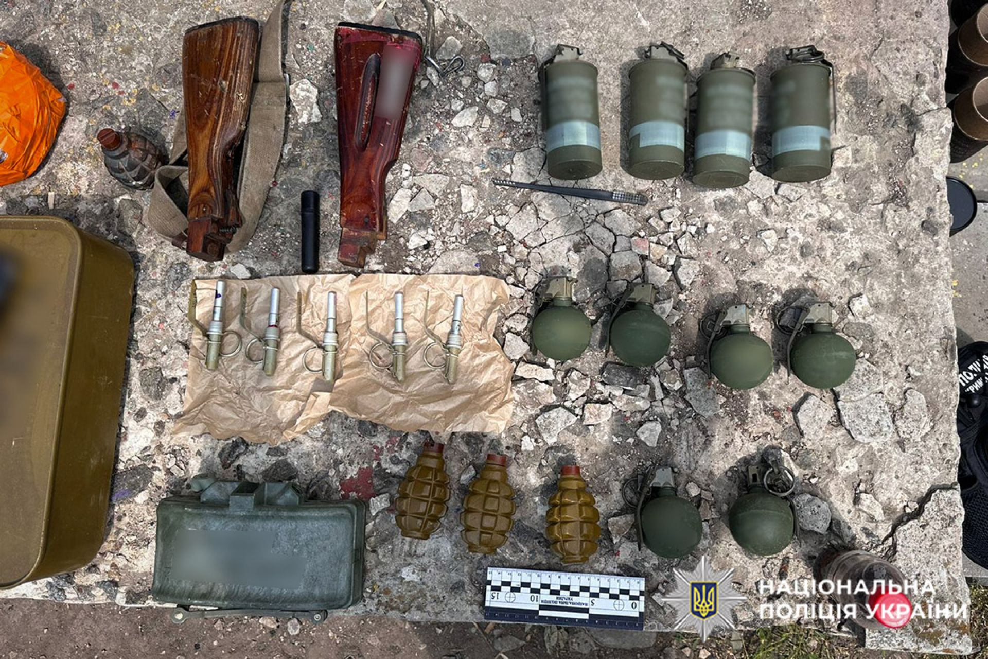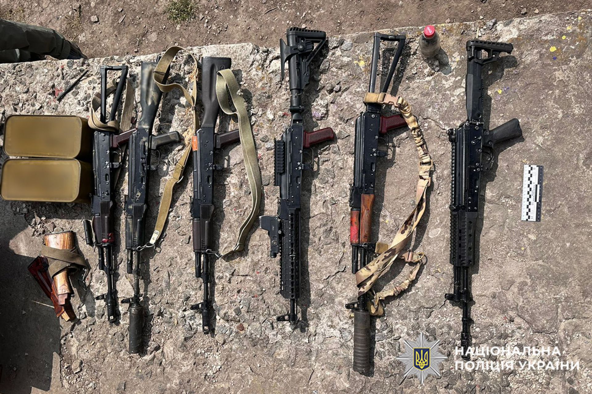 Під час обшуку було знайдено та вилучено понад 3 600 патронів калібру 9 мм, 7,72 мм та 5,45 мм, зокрема споряджених у кулеметну стрічку; шість автоматів Калашникова, оснащених коліматорними прицілами та глушниками; дев’ять гранат; протипіхотну міну, димові гранати та підривачі; магазини і численні запчастини до автоматичної зброї.
