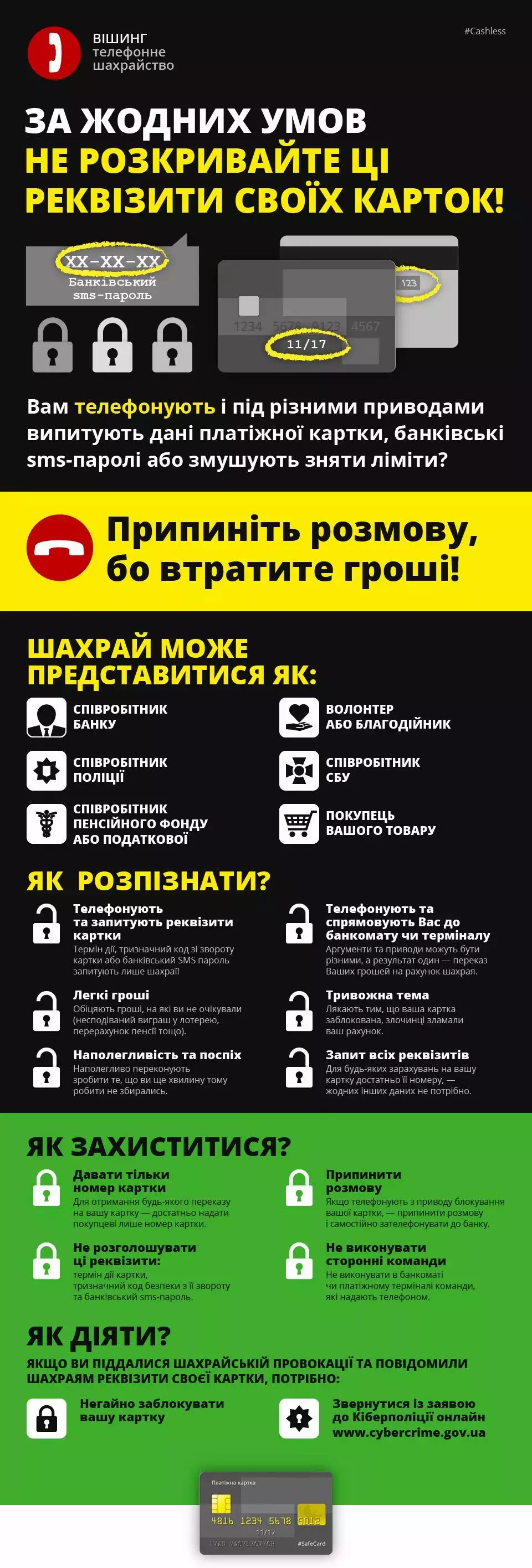 пін-код, CVV та термін дії картки (не повідомляйте їх навіть якщо співрозмовник представився банківським працівником — останні таких даних ніколи не запитують)
