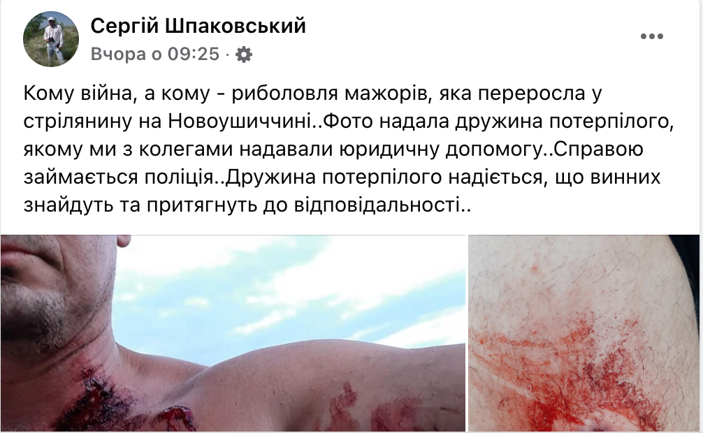 Про конфлікт на своїй сторінці у соцмережі пише також Сергій Шпаковський. Він виклав кілька світлин, які йому надала дружина пораненого з травматичної зброї. Увага! За посиланням чутливий вміст. Вразливим людям фото краще не переглядати.