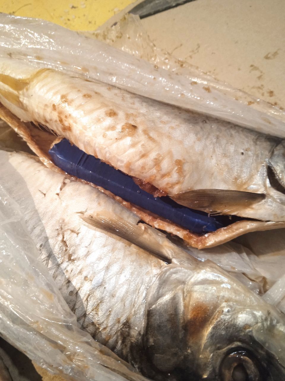 Працівники колонії почали перевіряти вміст посилки та побачили, що в пластикових контейнерах із жиром приховали мобільний телефон «САМСУНГ». Та родзинкою став Wi-Fi роутер, який винахідлива кам’янчанка сховала у середині оселедця.