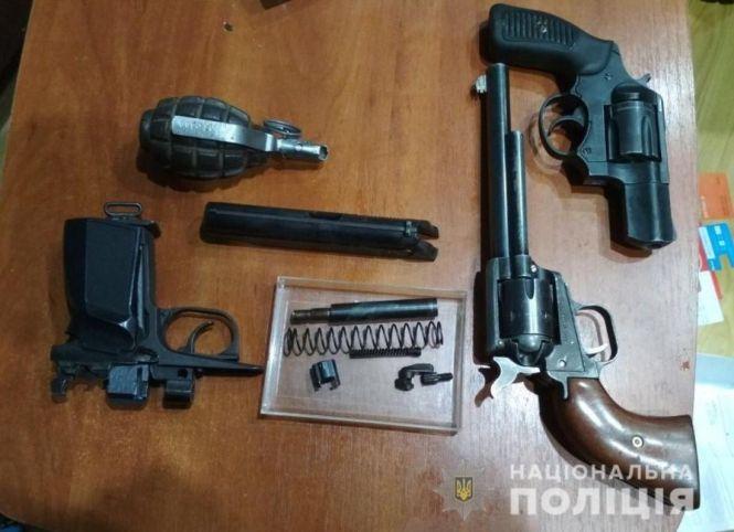 Під час обшуків у фігурантів вилучили чотири пістолети, три одиниці холодної зброї, предмет, схожий на гранату, мобільні телефони, банківські картки, готівкові гроші та чорнові записи.
