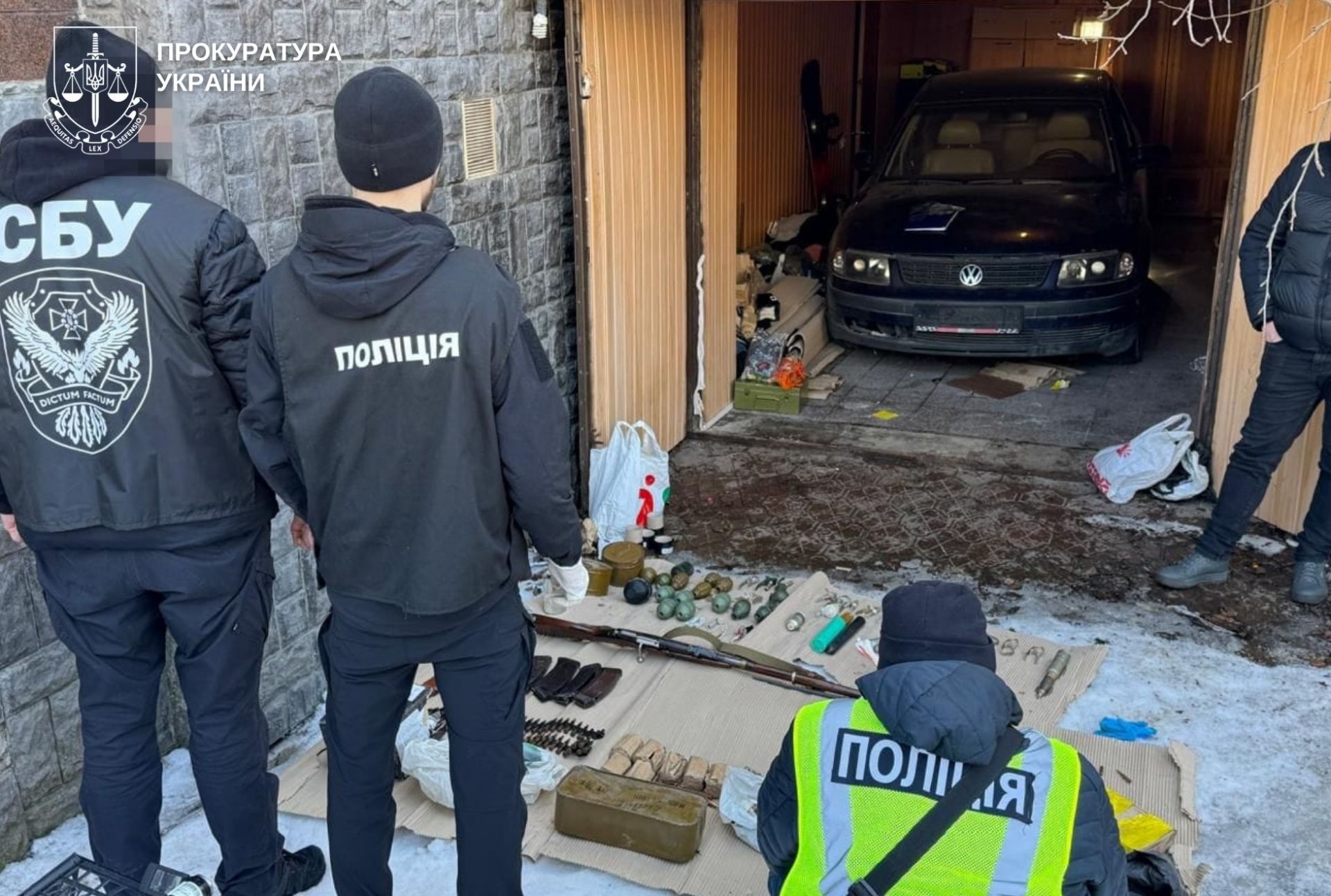 Під час обшуку за місцем проживання підозрюваного вилучили 14 корпусів гранат із запалами, дві димові шашки, 1,6 кг вибухової речовини, гвинтівку та понад дві тисячі набоїв різного калібру.