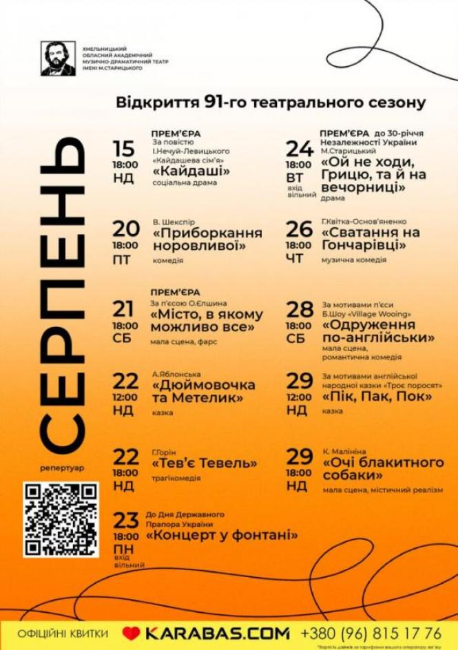 Цього року Хмельницький театр імені Михайла Старицького вперше відчинить свої двері влітку. Початок сезону, що зазвичай стартував у вересні-жовтні, призначили на 15 серпня. Вже впродовж цього місяця глядачам покажуть вистави українських та зарубіжних драматургів у класичному й сучасному прочитанні.