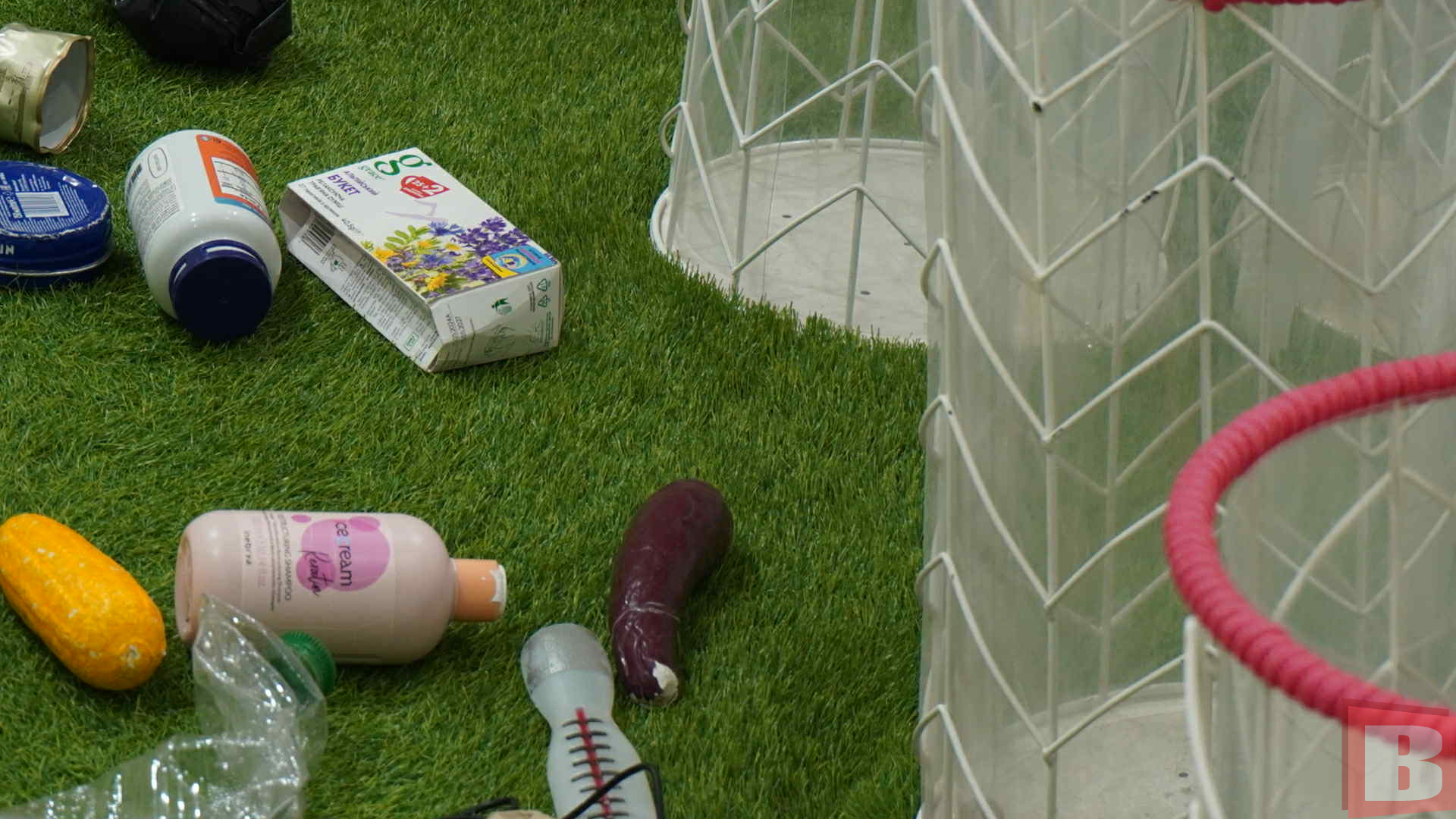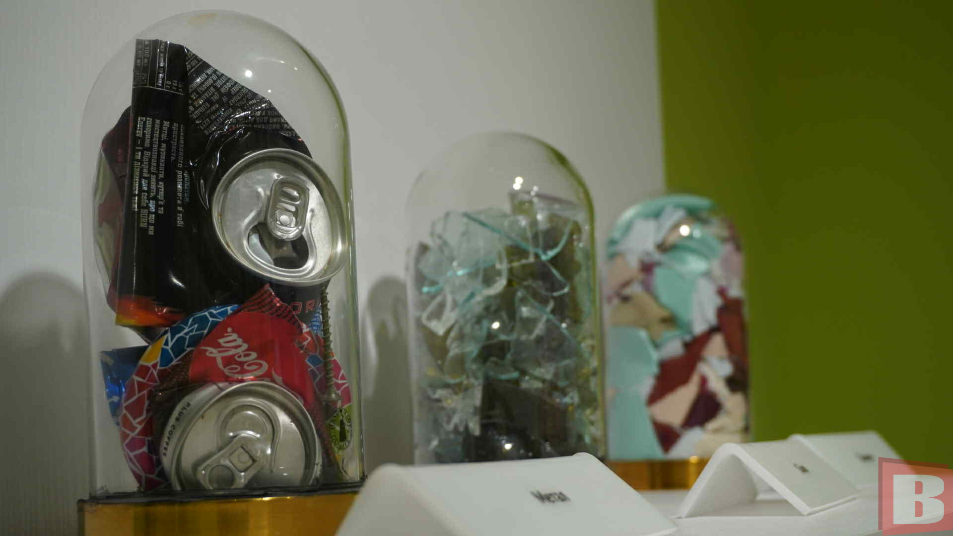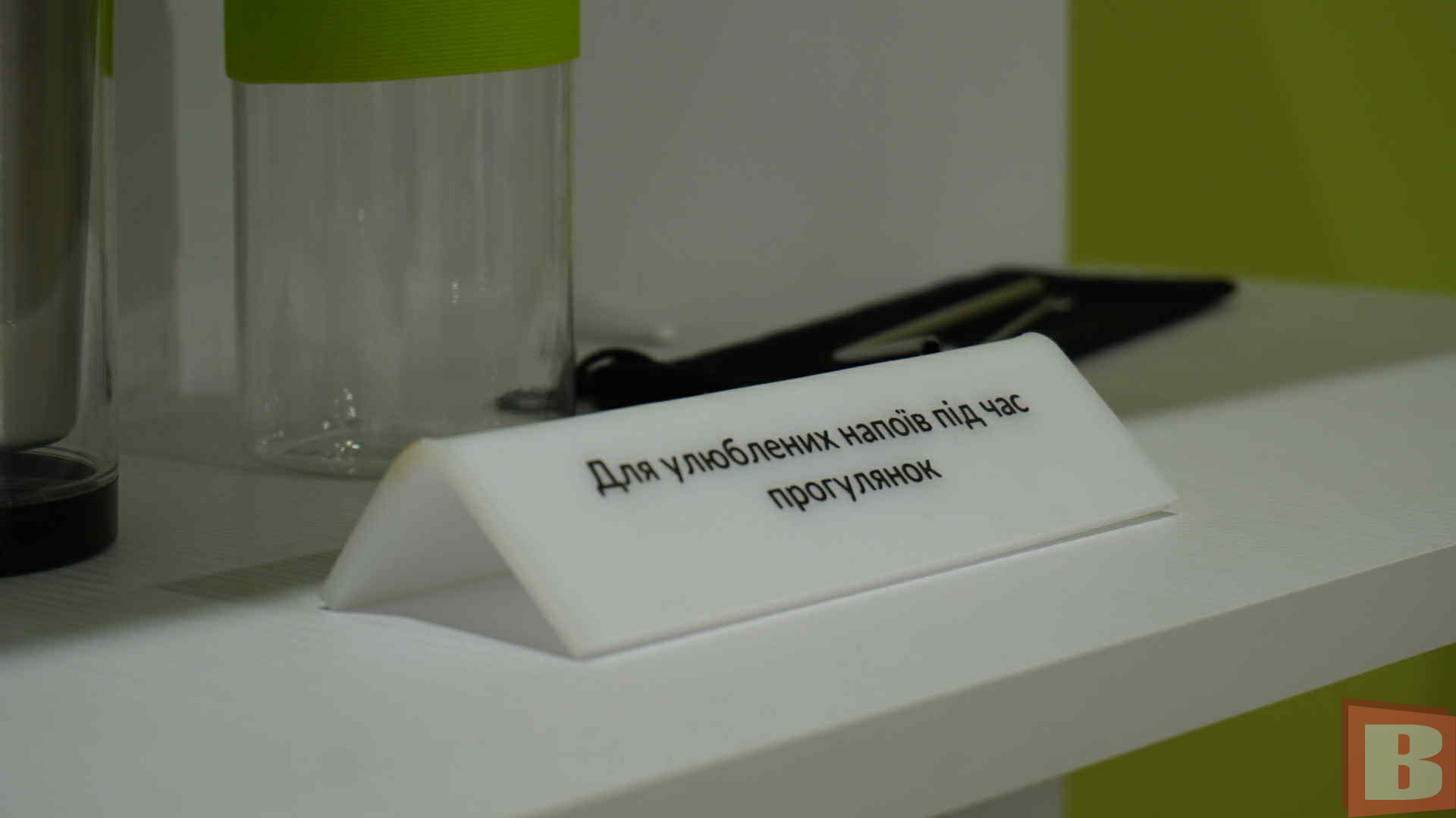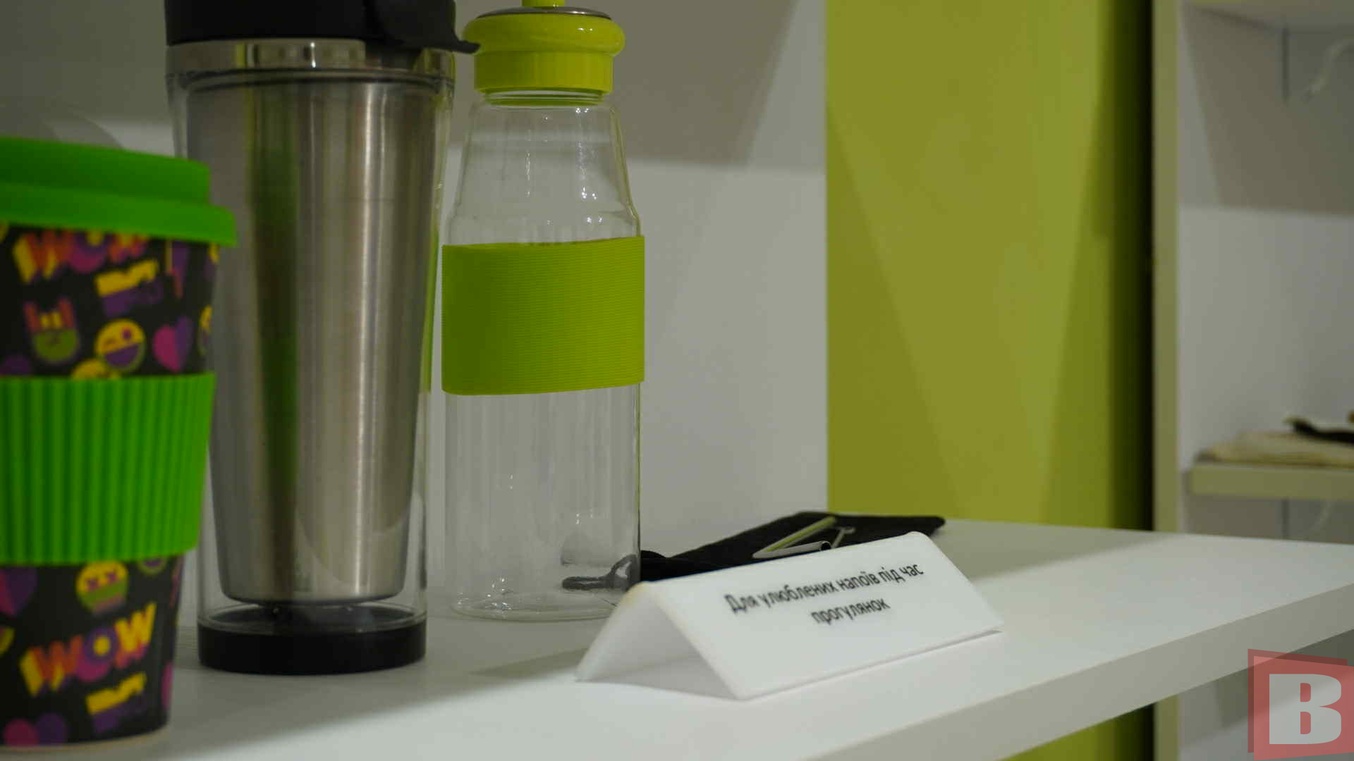Ну а тим, кому не цікаво слухати, можна познайомитися із наочним прикладом того, у що може перетворитися перероблене сміття. Для цього в кімнаті розмістили наступні предмети: канцелярію, що зроблена з паперу, склянки з врятованого скла, багаторазові бахіли зі зламаних парасольок чи, наприклад, пенал із банера фестивалю.
