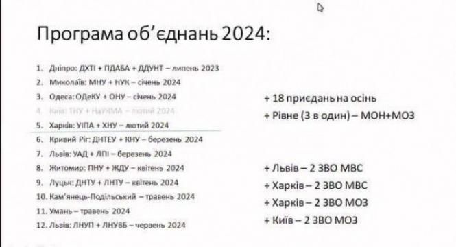 Відтак в цьому році об'єднати можуть вищі навчальні заклади у Миколаєві, Одесі, Харкові, Дніпрі, Львові, Житомирі, Рівному, Умані та Кам'янці.