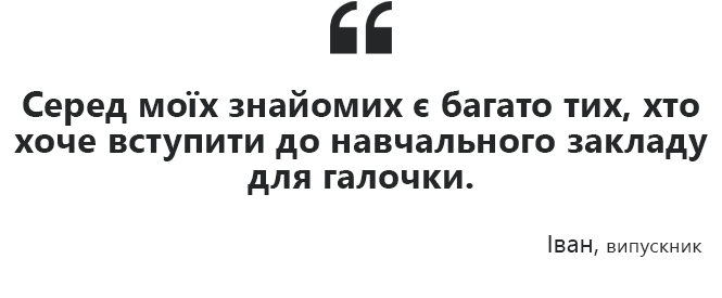 А от випускник Іван вже точно вирішив, де буде вчитися та ким працюватиме в майбутньому. Юнак мріє бути правоохоронцем тож і заклад для навчання він обрав відповідний. Разом із тим, Ваня каже про велику кількість друзів, які стануть студентами, бо “так треба”. Одинадцятикласник розповідає, що такі вступають на яку-небудь спеціальність і мають одну мету - отримати диплом.