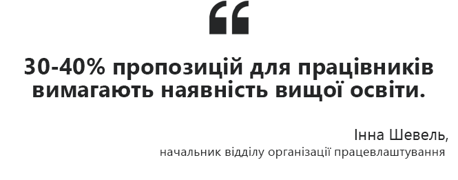 Щоб дізнатися, наскільки вища освіта сьогодні цінується, ми звернулися до обласного центру зайнятості. Начальник відділу організації працевлаштування Інна Шевель розповіла, що більша частина вакансій не потребує наявності вищої освіти.