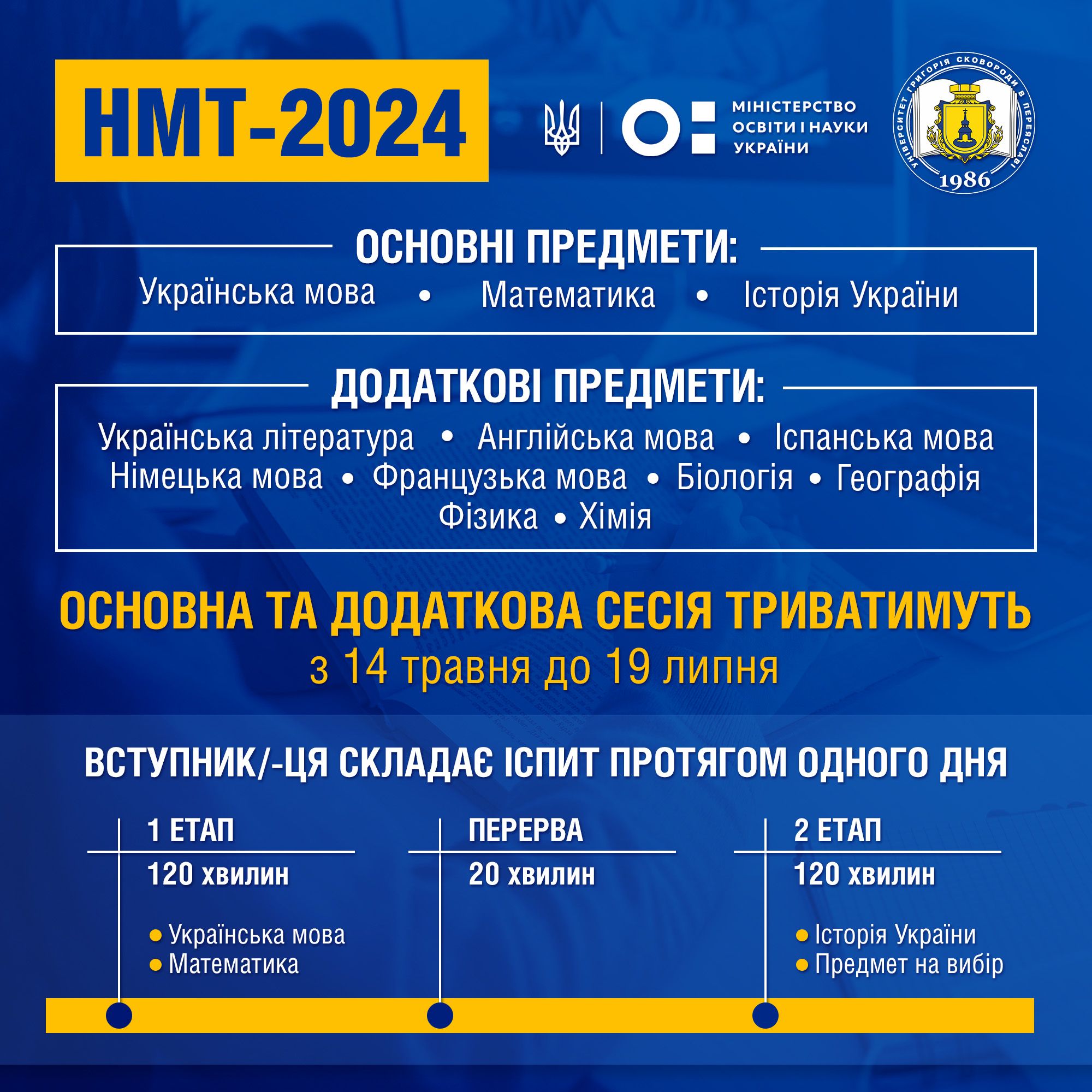 Вступники складатимуть іспит з усіх чотирьох предметів за один день. Перший етап триватиме 120 хвилин, і за цей час учасники НМТ проходитимуть перевірку на знання з української мови й математики. Після цього зроблять перерву на 20 хвилин. Після відпочинку почнеться другий етап, який також триватиме дві години. За цей час вступники проходитимуть тести з історії України та предмету на вибір.