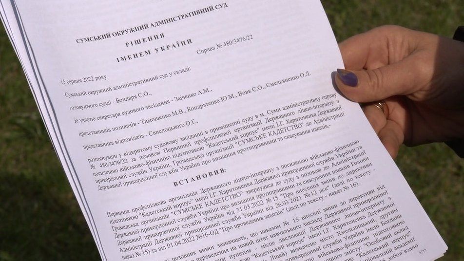 Батьківська громадська організація «Сумське кадетство» та профспілка Державного ліцею-інтернату з посиленою військово-фізичною підготовкою «Кадетський корпус» імені І. Г. Харитоненка виграли суд у Державної прикордонної служби про незаконність переведення навчального закладу з Сум до Хмельницького.