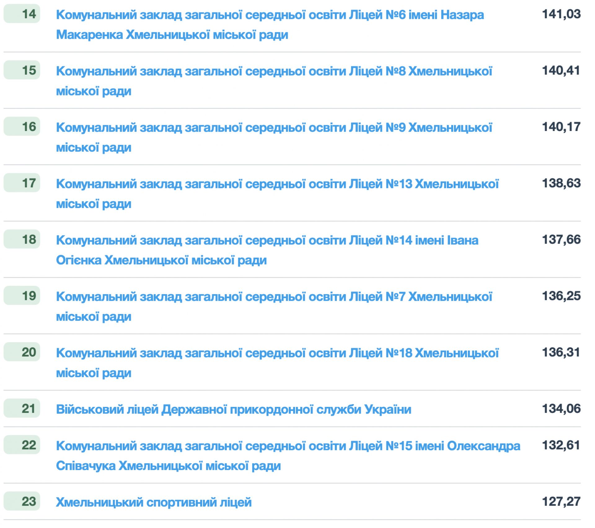 Усього в рейтингу — 23 хмельницькі школи, серед яких також Ліцеї №5, №4, №10, №6, №8, №9, №13, №14, №7, №18, військовий ліцей Державної прикордонної служби, Ліцей №15 і спортивний ліцей.