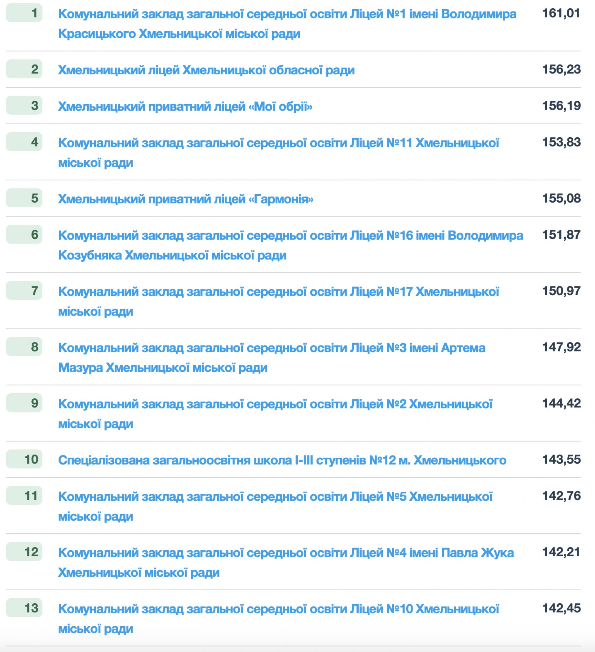 - Ліцей №11 Хмельницької міської ради — 153,83 бала;