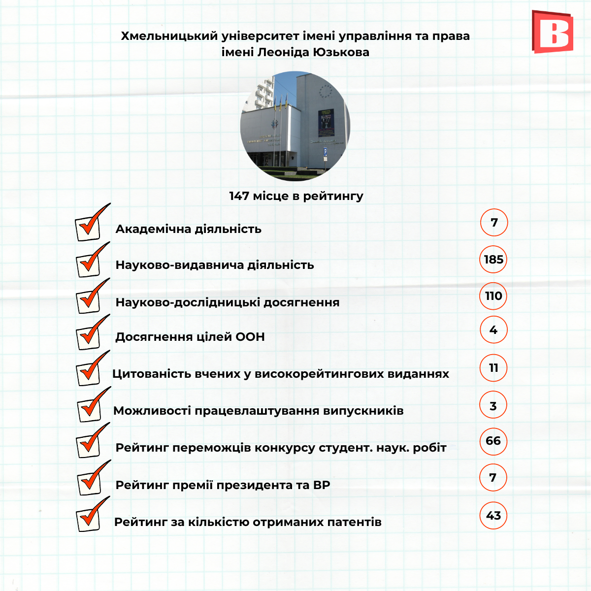 Кожен навчальний заклад займає місце в конкретній номінації. Таких є 9. Дивіться далі в інфографіці, які хмельницькі ВНЗ увійшли до рейтингу-2022 та їхні позиції в різних категоріях.