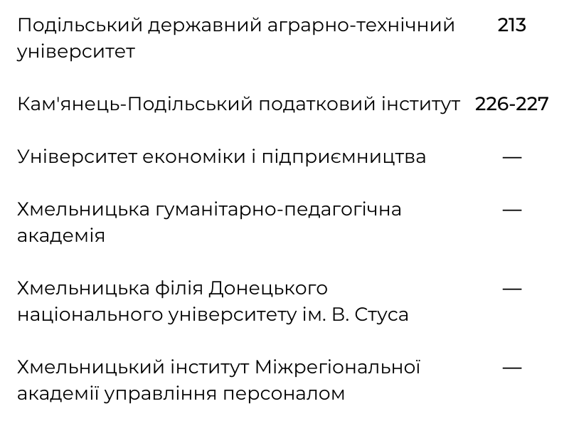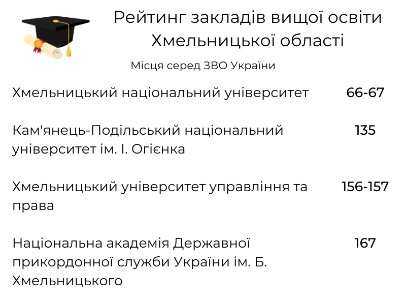 Загалом перелік включає 242 заклади. Найвищу сходинку серед хмельницьких вишів має Хмельницький національний університет — 66-67 (спільне місце з Національним лісотехнічним університетом). У рейтингу налічується також п’ять закладів Хмельницької області. Консолідований рейтинг розроблений на базі трьох інших рейтингів — «Топ-200 Україна», «Scopus» та «Бал ЗНО на контракт». Детальніше в інфографіці.