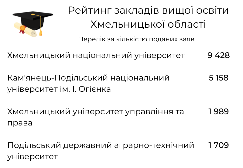 Ми переглянули відомості щодо кількості поданих заяв на вступ до кожного закладу Хмельниччини. У цьому рейтингу лідирує, знову ж таки, Хмельницький національний університет. Детальніше в інфографіці.