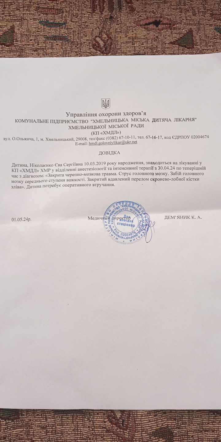 Наразі 5-річна Єва перебуває в Хмельницькій міській дитячій лікарні. А саме – у відділенні анестезіології та інтенсивної терапії. Згідно з довідкою, яку опублікувала мати дівчинки в соцмережах, діагноз – закрита черепно-мозкова травма, струс головного мозку, забій головного мозку середнього ступеня важкості. А також – закритий вдавлений перелом скронево-лобної кістки.
