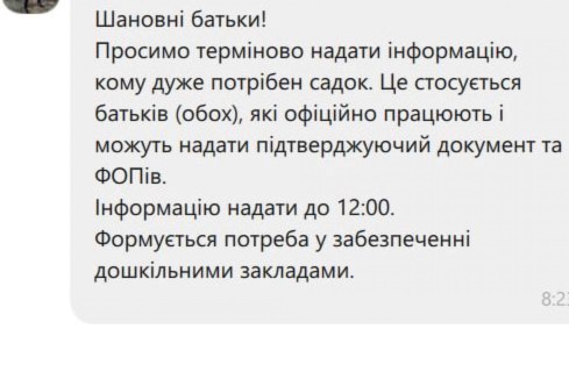 У повідомленні просять терміново надати інформацію, кому потрібен садок. Йдеться про батьків, якщо вони обидва офіційно працевлаштовані або мають є ФОП. А далі їх просять принести підтверджуючий документ.