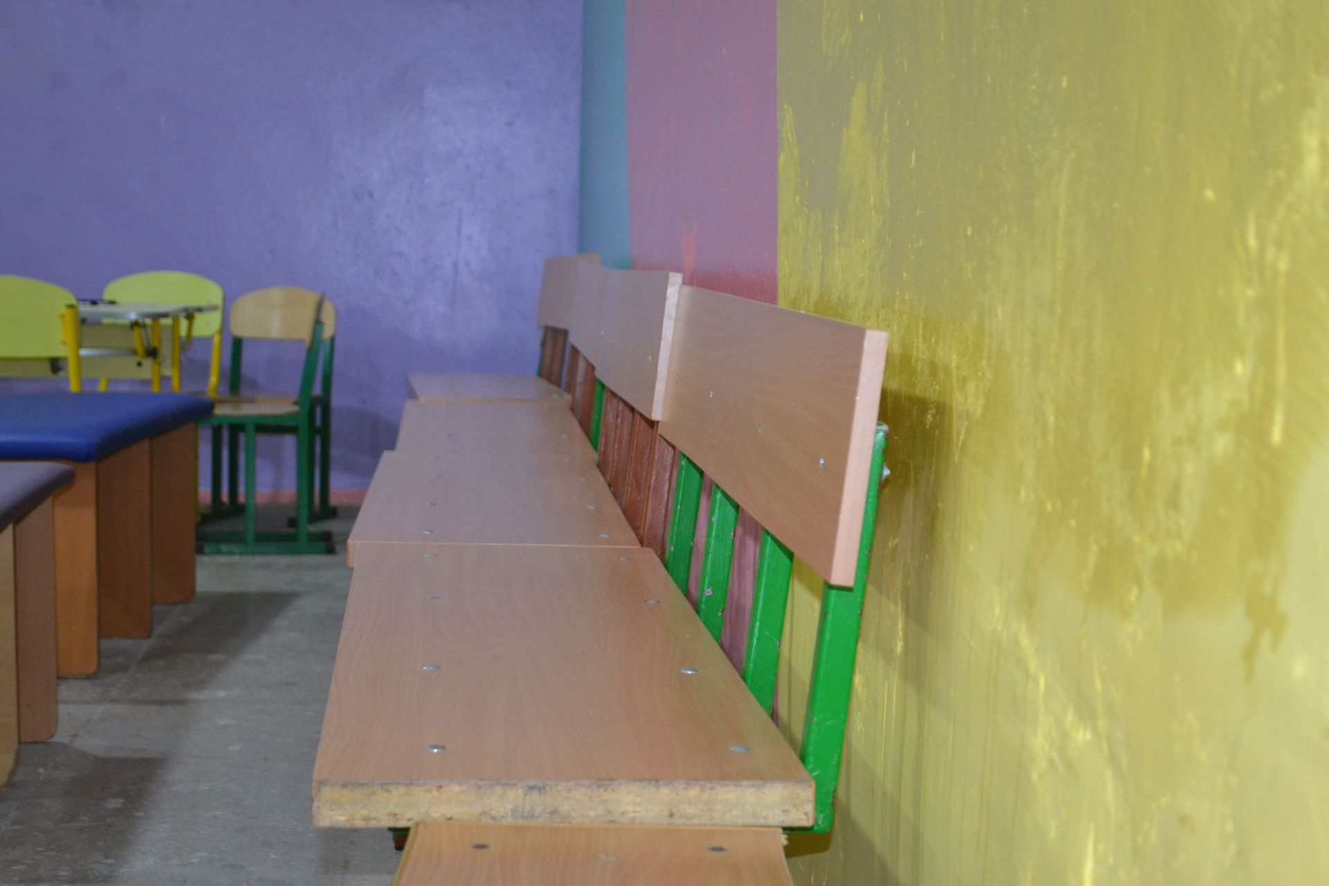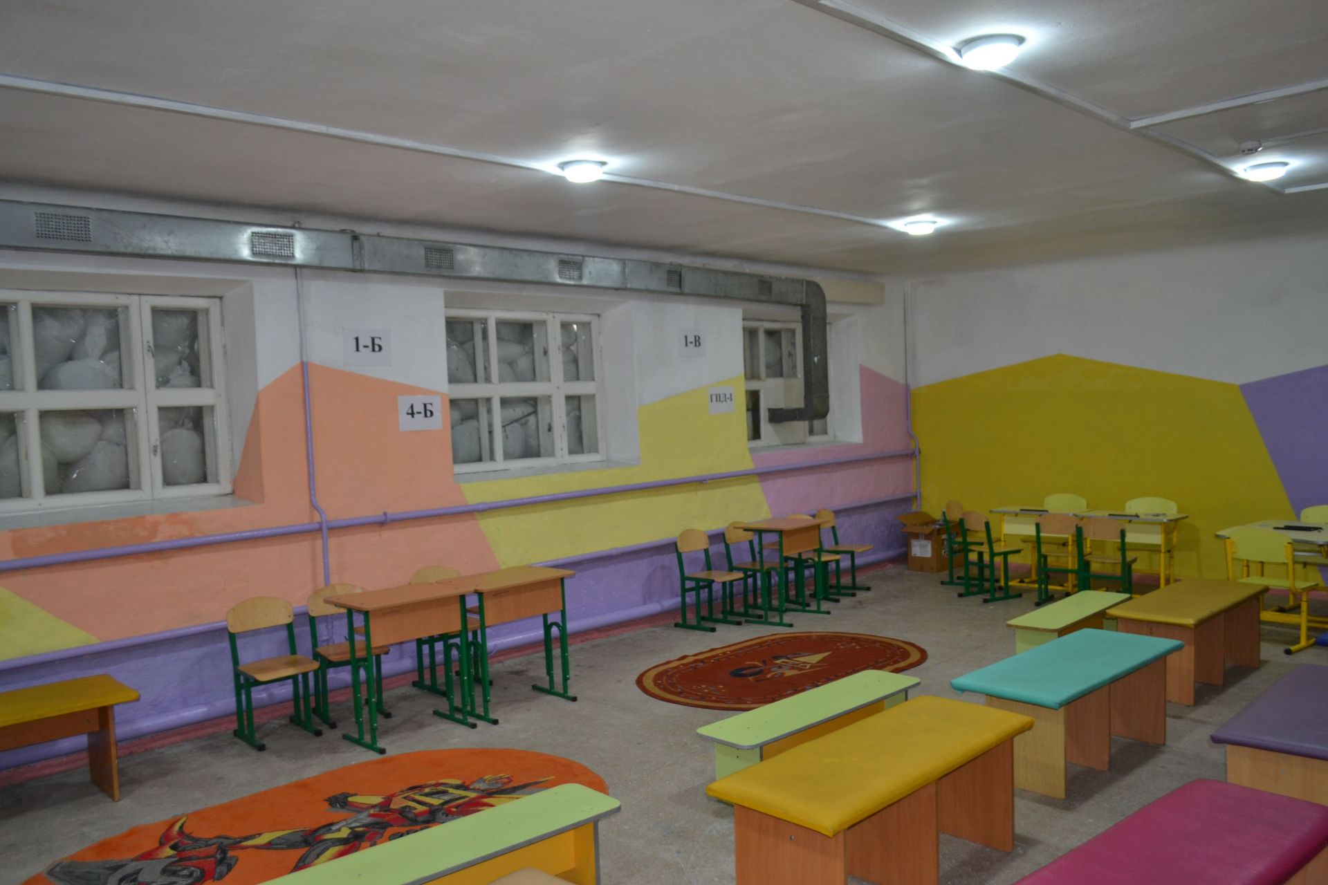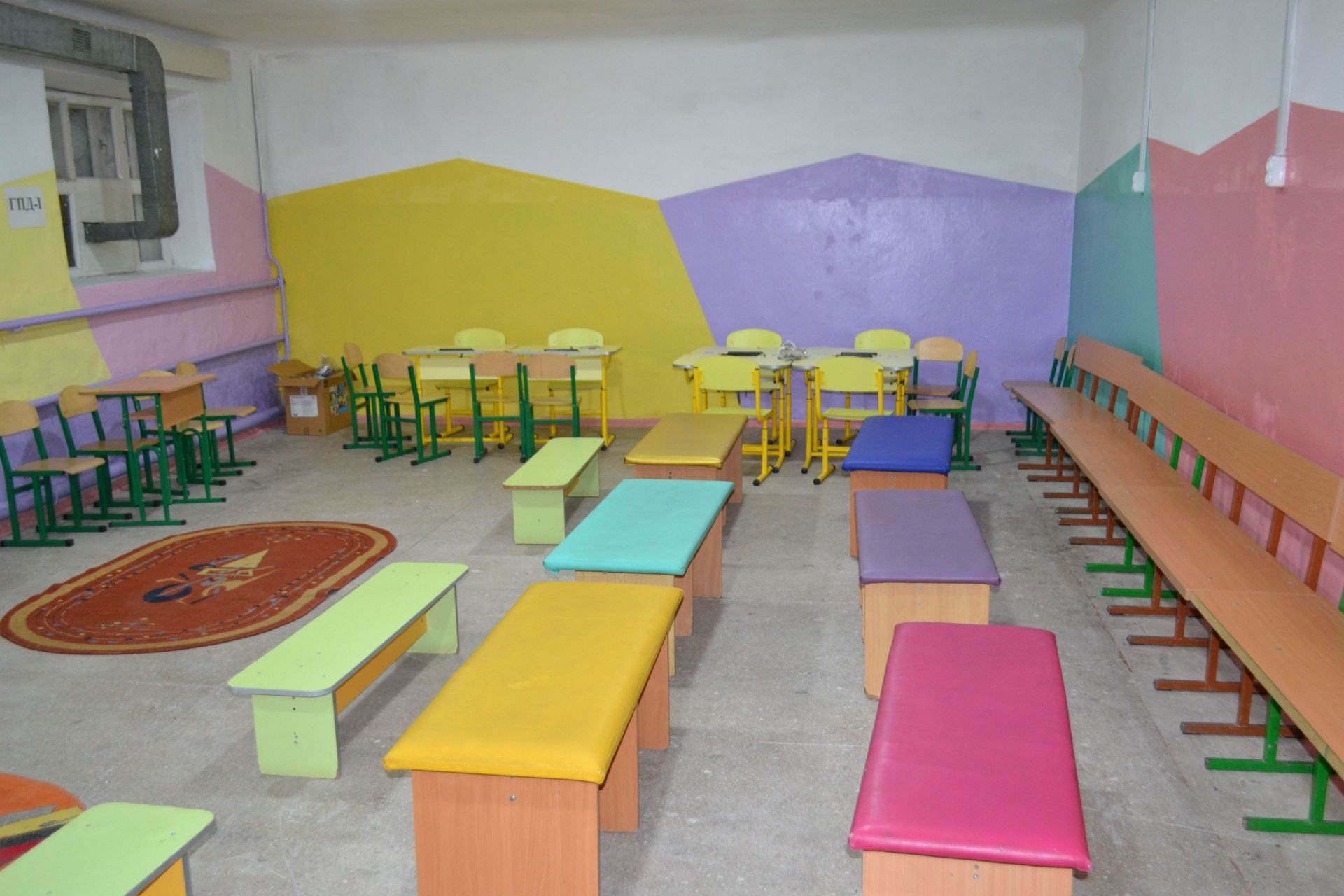 Поглянемо, як виглядає кожне з таких приміщень. Зовні вони нагадують окремі класи. Під стіною в ряд стоять стільчики. По центру є парти, лавки, деякі навіть з м’якими сидіннями. На підлозі - килимки. У кожному кутку підготовлені запаси питної води із стаканчиками. Також скрізь є вогнегасники - це обов’язкова умова.