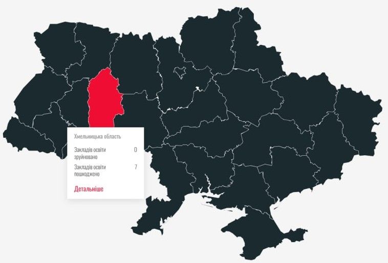 Нагадаємо, ми повідомляли, що пошкоджені школа та садочок є й на Хмельниччині. Не минуло й місяця, як їх кількість збільшилась більш, ніж тричі. Відтепер, згідно мапи Saveschoois в області пошкоджено 7 закладів — 3 дитячих садочки та 4 школи. Місце їх розташування, звісно ж, не уточнюється.