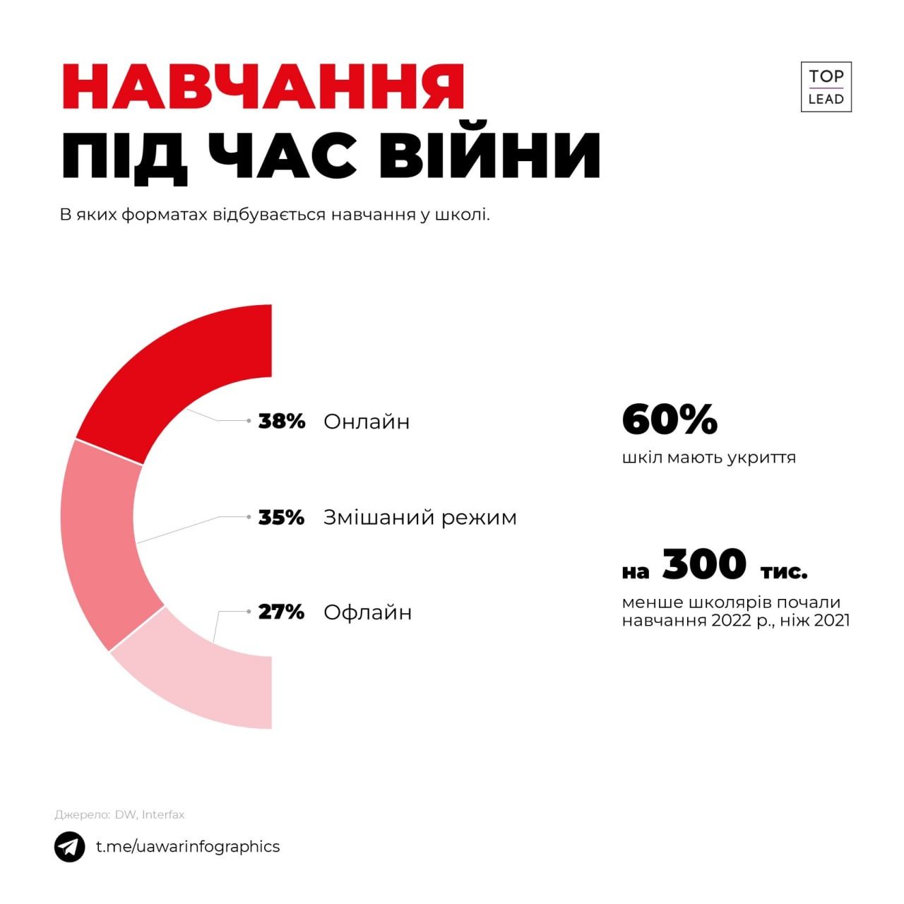 Нагадаємо, 1 вересня в Україні почався навчальний рік. Згідно даних каналу UA War Infographics трохи більше чверті шкіл в Україні працюють офлайн, третина — у змішаному режимі. Відповідні рішення щодо вибору форми навчання ухвалюють на місцях.