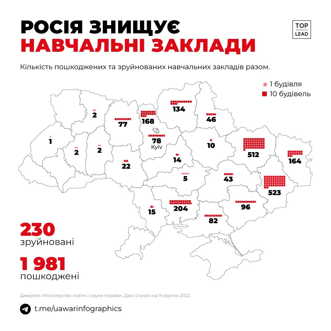 На сьогодні вже 2211 закладів освіти постраждали від бомбардувань та обстрілів. 230 з них зруйновано вщент. 1981 заклад пошкоджено.