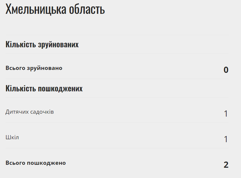 На Хмельниччині від ворожих ударів, згідно інформації на мапі, постраждало 2 заклади — школа та дитячий садок. Який характер руйнувань та де саме знаходяться заклади на сайті не вказується. Інформацію також підтвердив очільник Хмельницької ОВА.