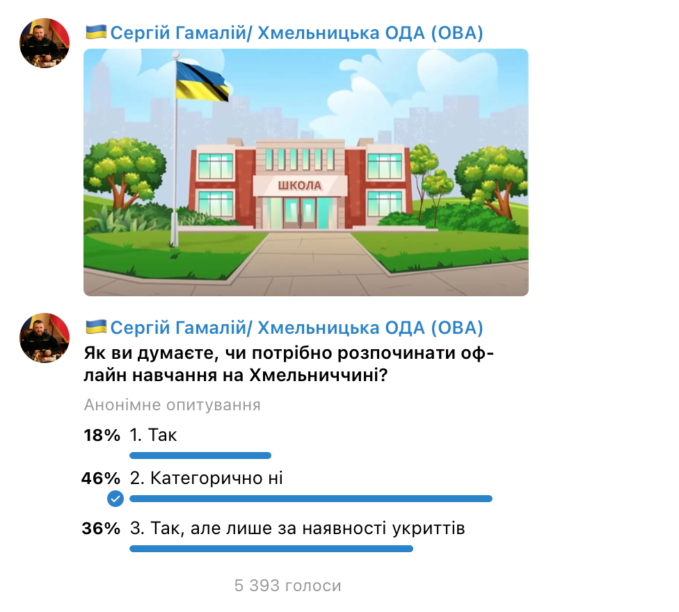 Схоже опитування у своєму Телеграм-каналі запропонував і голова Хмельницької ОВА Сергій Гамалій.