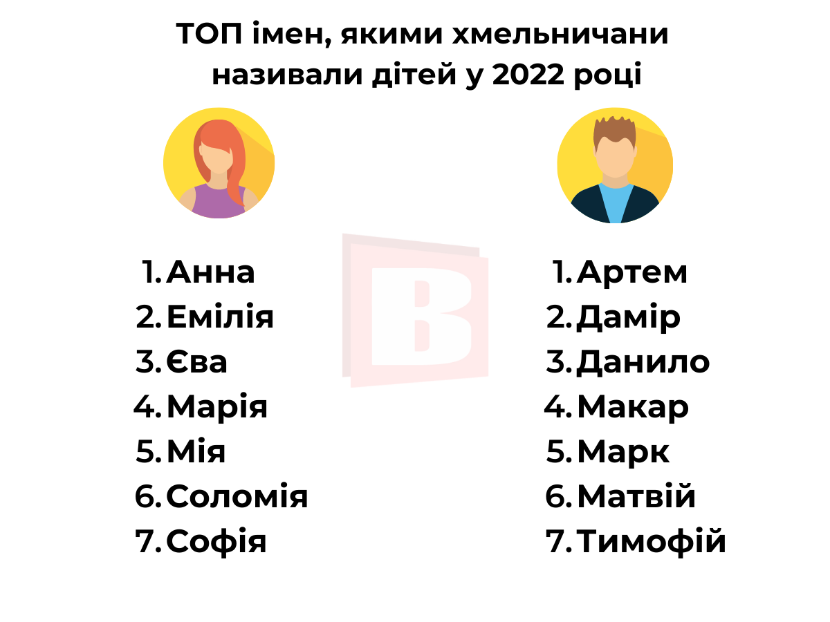 На основі даних за 2022 рік було складено перелік найпопулярніших серед хмельничан. Серед усіх переважають традиційні з-поміж українців імена. 14 жіночих та чоловічих найпоширеніших переглядайте в інфографіці.