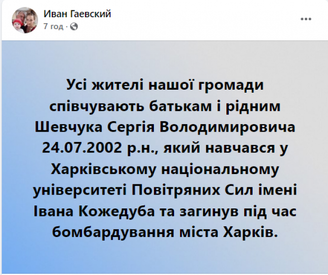 "Усі жителі нашої громади співчувають батькамі рідним Шевчука Сергія Володимировича 24.07.2002 року народження, який навчався у Харківському національному університеті Повітряних Сил імені Івана Кожедуба і загинув під час бомбардування міста Харків", – йдеться в повідомленні.