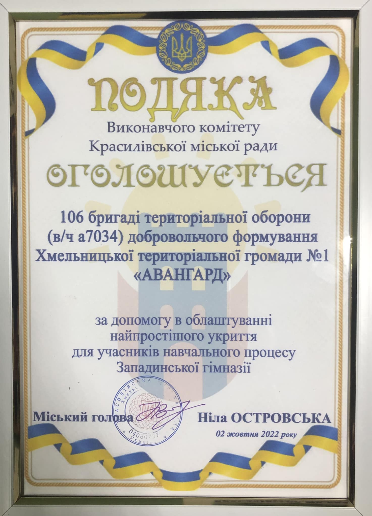 На знак вдячності за пророблену роботу красилівська міська голова Ніла Островська вручила нашим бійцям відзнаку.