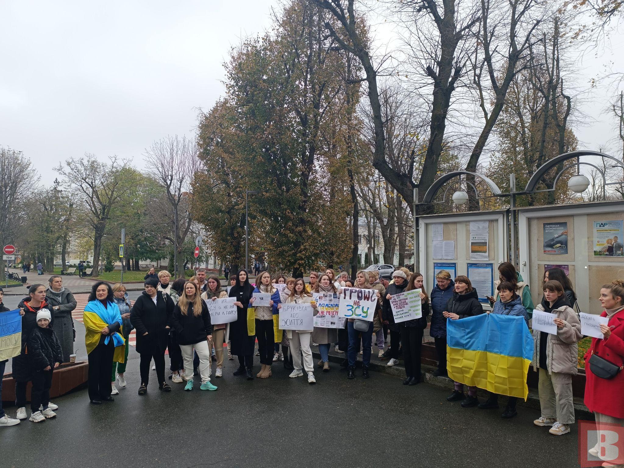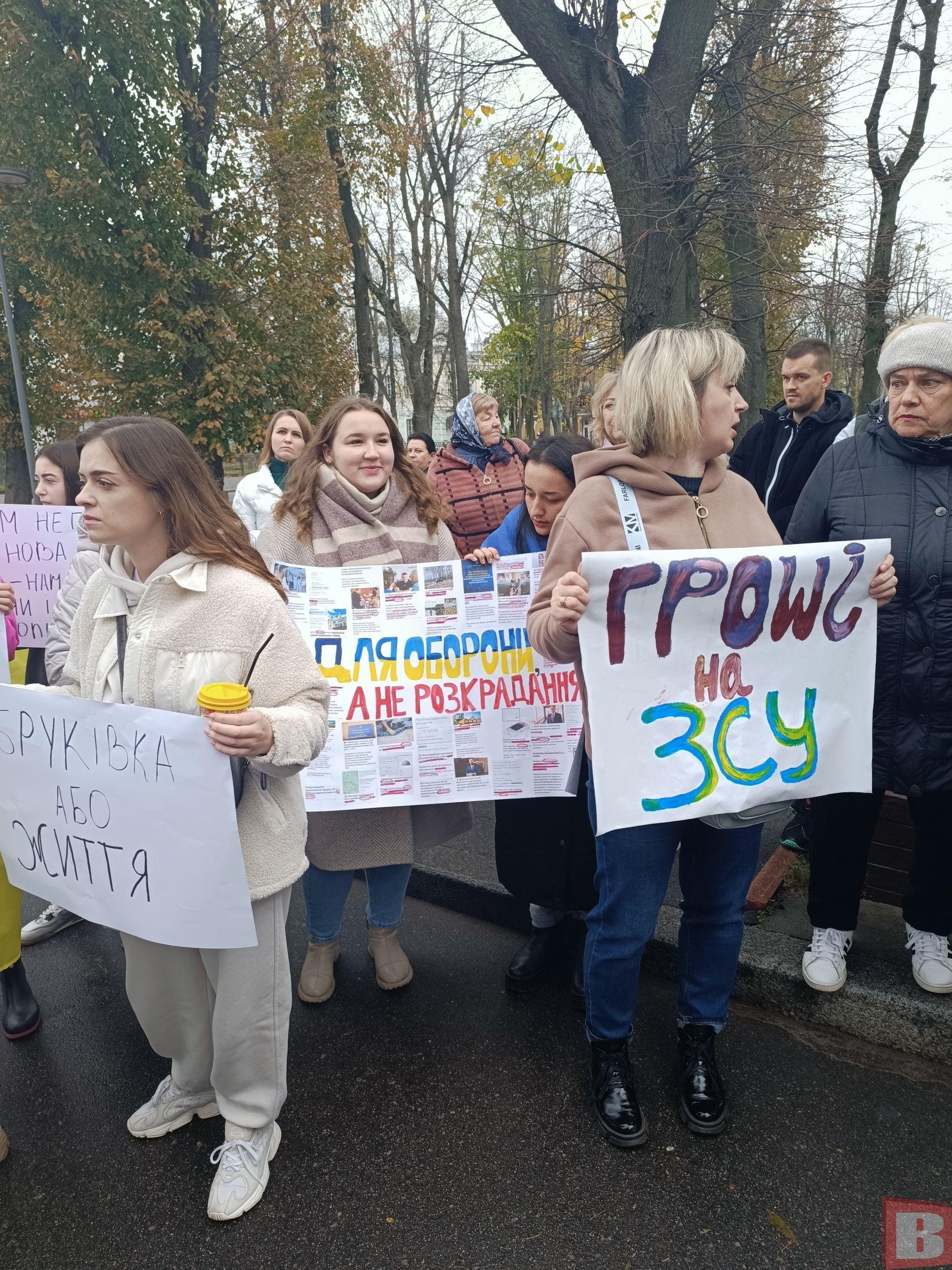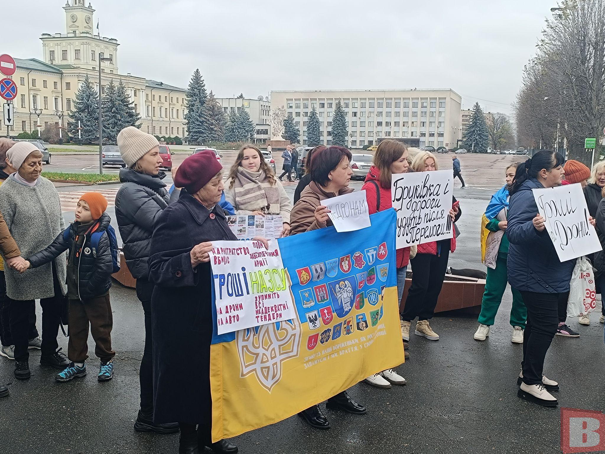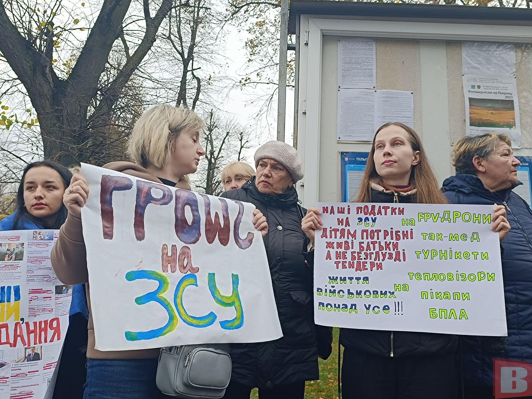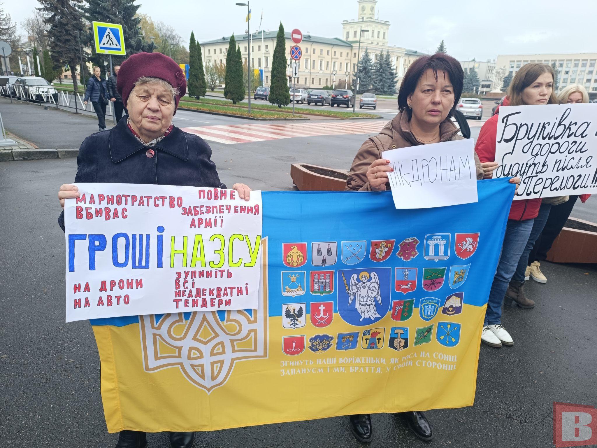 Сьогодні, 4 листопада, подібну акцію провели і у Хмельницькому. Близько 10-тої ранку люди зібрались під будівлею міської ради. Тут є дружини, матері військових, підлітки та просто небайдужі хмельничани. В руках плакати “Бруківка або життя”, “Гроші на дрони”, “Марнотратство вбиває - зупиніть всі неадекватні тендери!”, “Бруківка та дрони будуть після Перемоги”.