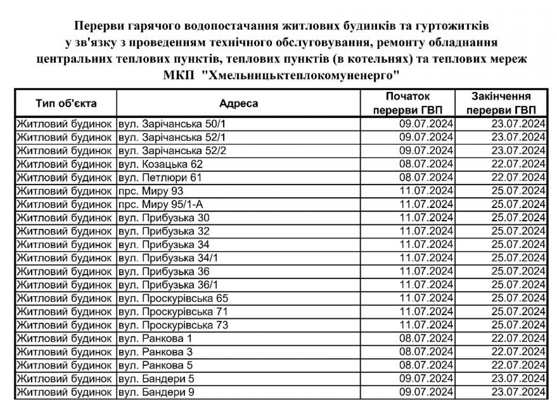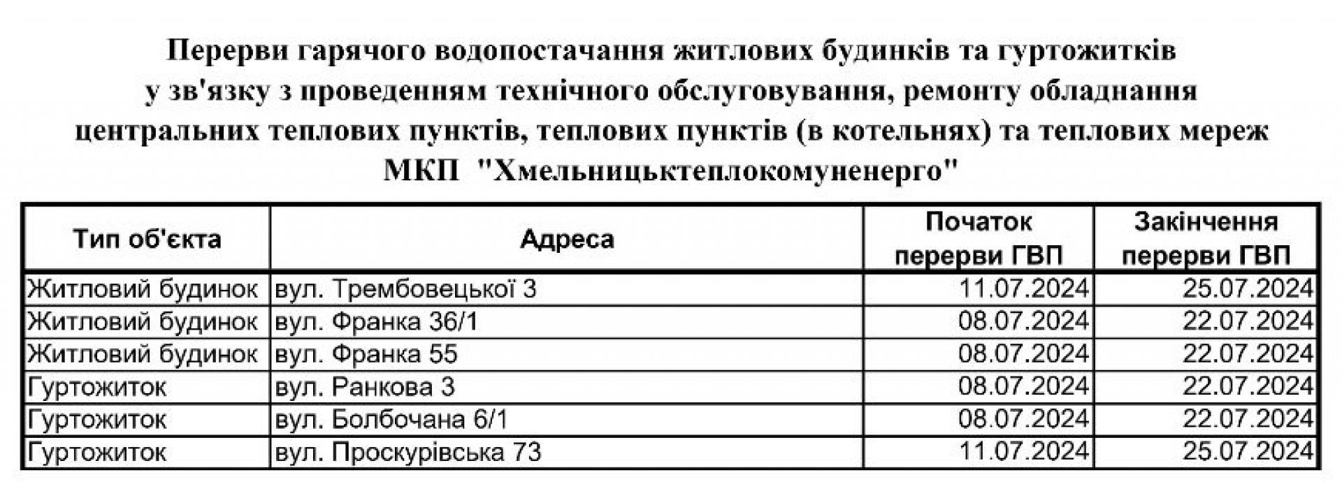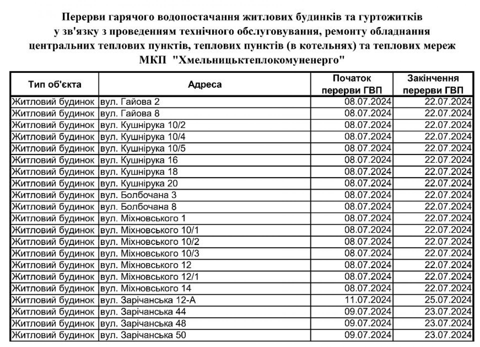 Графік перерв водопостачання у житлових будинках і гуртожитках Хмельницького подали у МКП «Хмельницьктеплокомуненерго». Відповідно до нього, вимикатимуть гарячу воду приблизно на два тижні починаючи з понеділка, 8 липня.