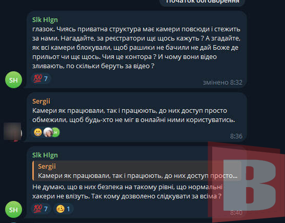 Однак у соціальних мережах зустрічаються короткі відео з таких записів: мітингів, акцій тощо. В хмельницьких пабліках найбільш розповсюджені – фрагменти ДТП. У коментарях під одним із таких відео, яке опублікувало vsim.ua зі сторінки компанії «Глазок», користувачі обурилися тому, що в умовах воєнного стану проводиться відеозйомка міста. До слова, дана компанія має встановлені камери відеоспостереження на 35 вулицях міста.