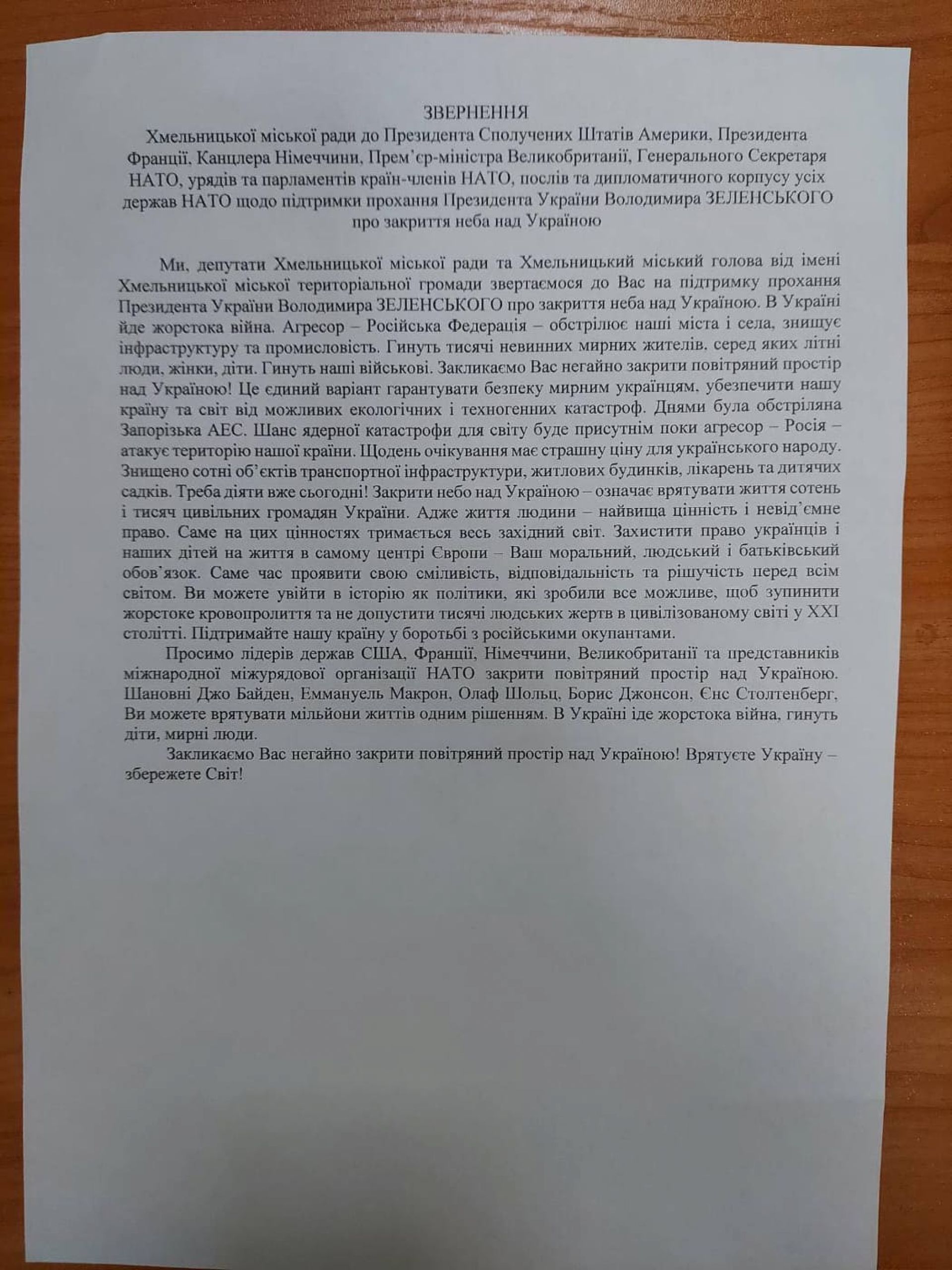 "З метою негайного донесення до міжнародної спільноти необхідності впровадження зони А2/АD над територією України. Міська рада вирішила звернутись до президента США, Франції, Канцлера Німеччини, Прем’єр-міністра Великобританії, Генерального Секретаря НАТО, урядів та парламентів країн-членів НАТО, послів та дипломатичного корпусу усіх держав НАТО щодо підтримки прохання Президента України Володимира Зеленського про закриття неба над Україною", - йдеться у документі.