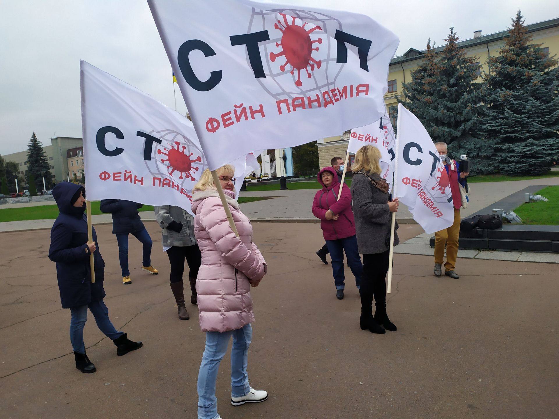 Серед учасників мітингу був і власник "СВ" Віктор Вікарчук. Допоки він вів пряму трансляцію з місця події, працівники його закладу прийшли із прапорами, на яких було написано “Стоп фейк пандемія”.