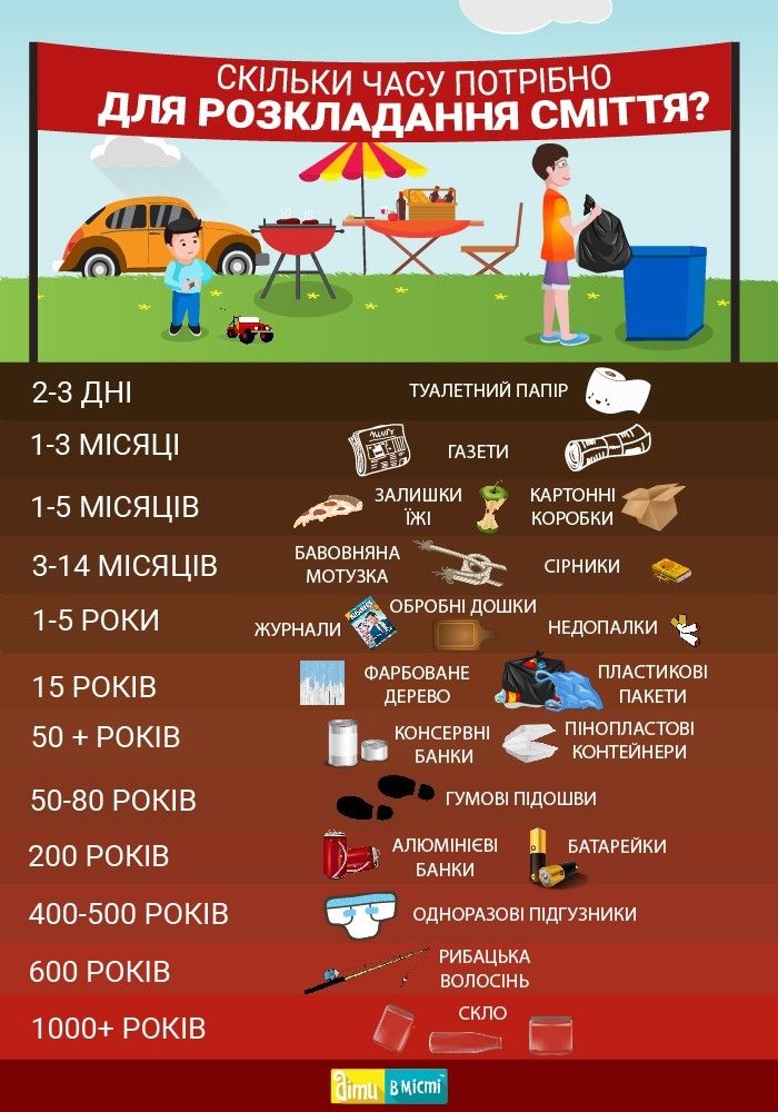 Залишкове сміття: це те, що залишилось після того як ви посортували відходи (скоч, «шур шик», гігієнічні прокладки та серветки, обгортки та продукти без маркування, поламані предмети). Цю частину відходів слід відправляти на полігон. Старий одяг, який ще може прослужити, не викидайте, а віддайте у благодійний фонд.