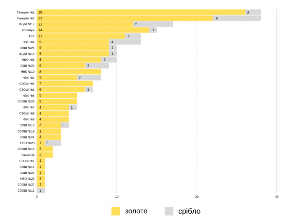 Рейтинг шкіл очолила Гімназія № 1. Її випускники отримали 28 медалей - 26 золотих та 2 срібні. У Гімназії №2 теж 28 нагород - 22 золотих та 6 срібних. Трійку лідерів закриває ліцей № 17. Серед його випускників 12 золотих та 5 срібних медалістів.