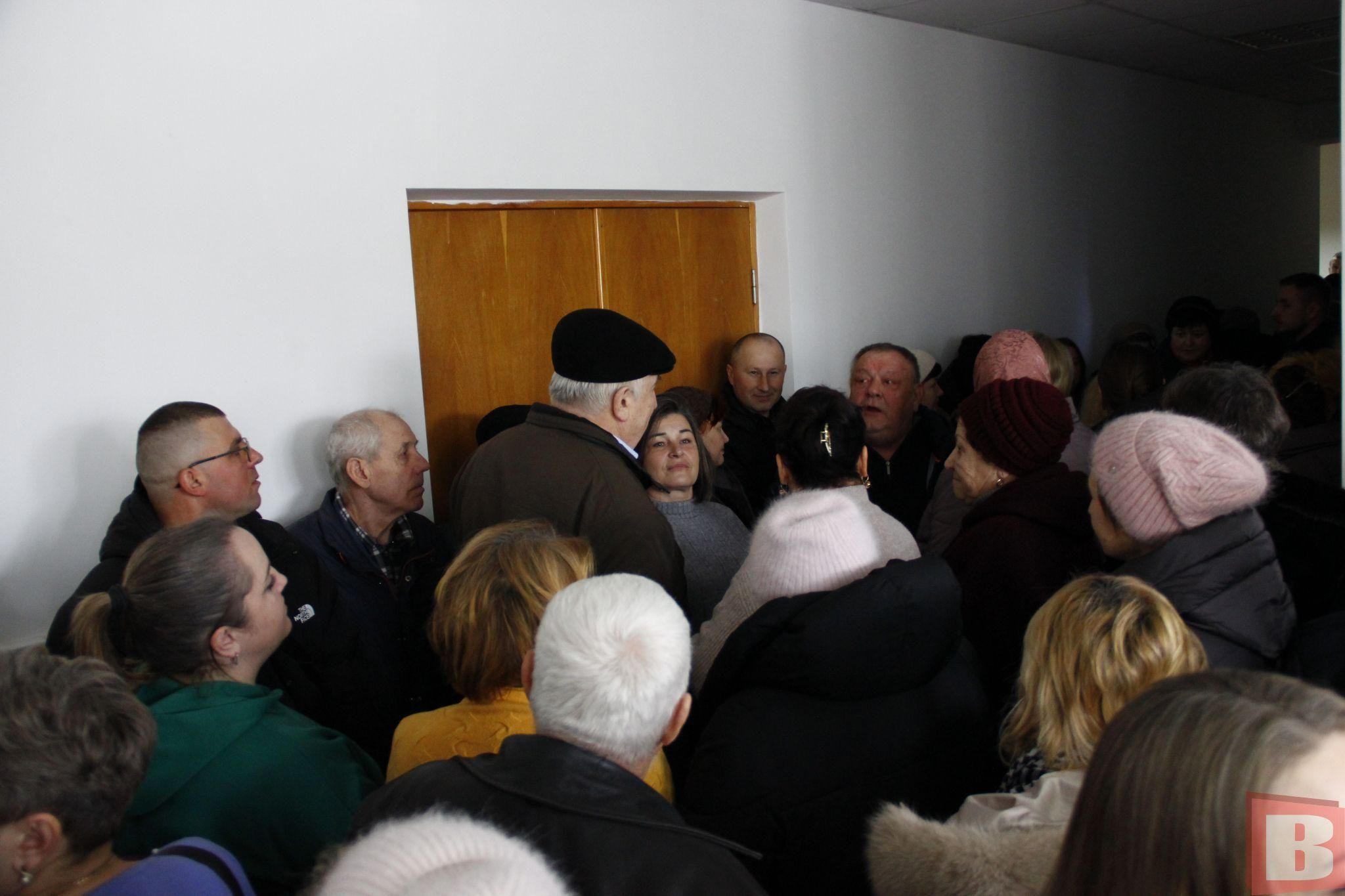 Люди товпилися під дверима сесійної зали до 10:20. Паралельно, повз натовп, проходили депутати райради та реєструвалися. Та із 64 обранців були присутні лише 19. І коли людей впустили у залу голова районної ради Богдан Цимбалюк оголосив про те, що бракує голосів для проведення сесії та її переносять.
