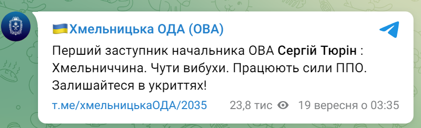 Ніч на 19 вересня в Україні знову не пройшла спокійно. У низці областей оголосили тривогу через загрозу атаки “шахедами” та ракетами. Не оминула тривога і Хмельниччину.