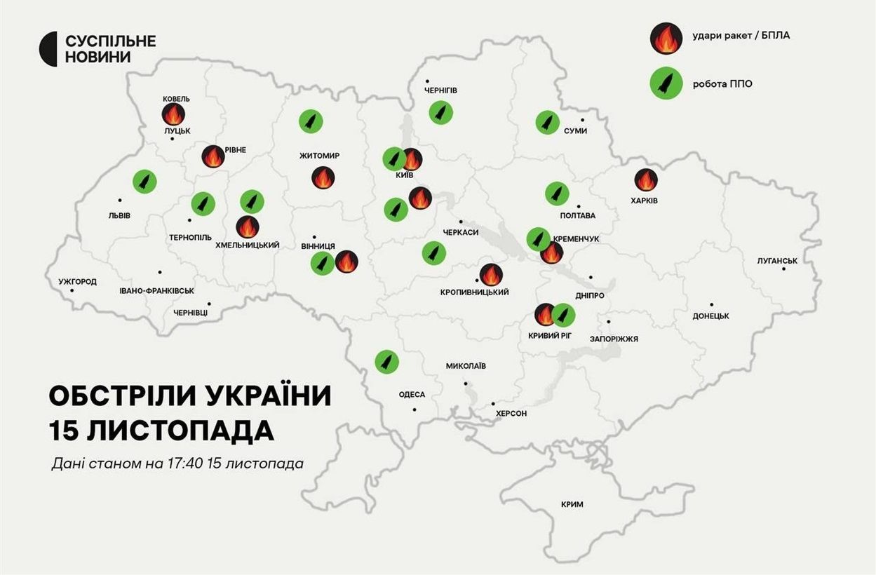 Але є влучення – пошкоджено 15 об'єктів енергетичної інфраструктури.