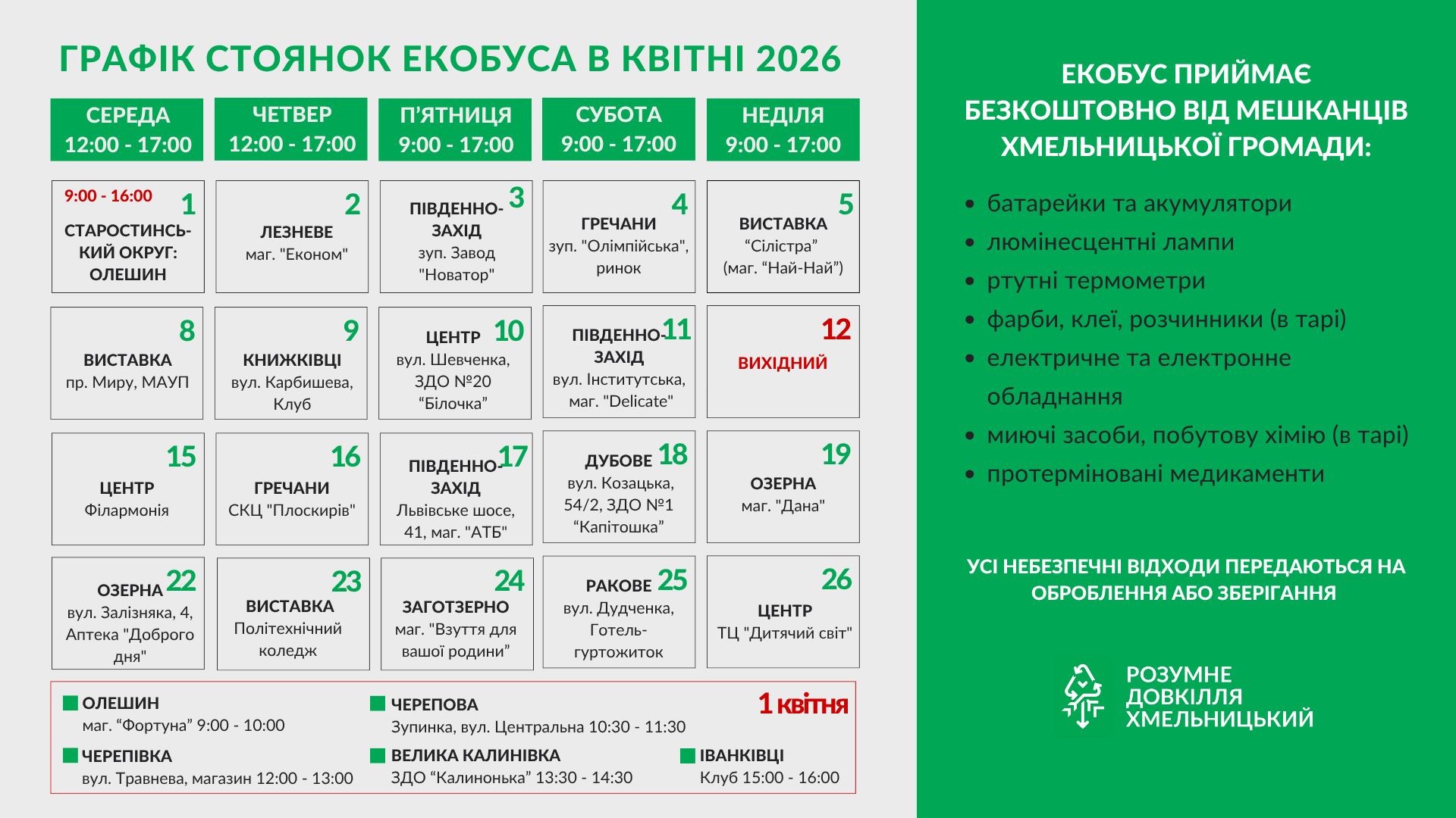Цього місяця екобус працюватиме по середам і четвергам — з 12:00 до 17:00, із п’ятниці по неділю — з 09:00 до 17:00. «Розумне довкілля.Хмельницький» попередили: 12 квітня (у неділю) екобус не працюватиме. Понеділки та вівторки традиційно вихідні. Крім того, із поточного місяця екобус не зупинятиметься на локації за адресою вулиця Я. Гальчевського, ТЦ «55-й магазин".