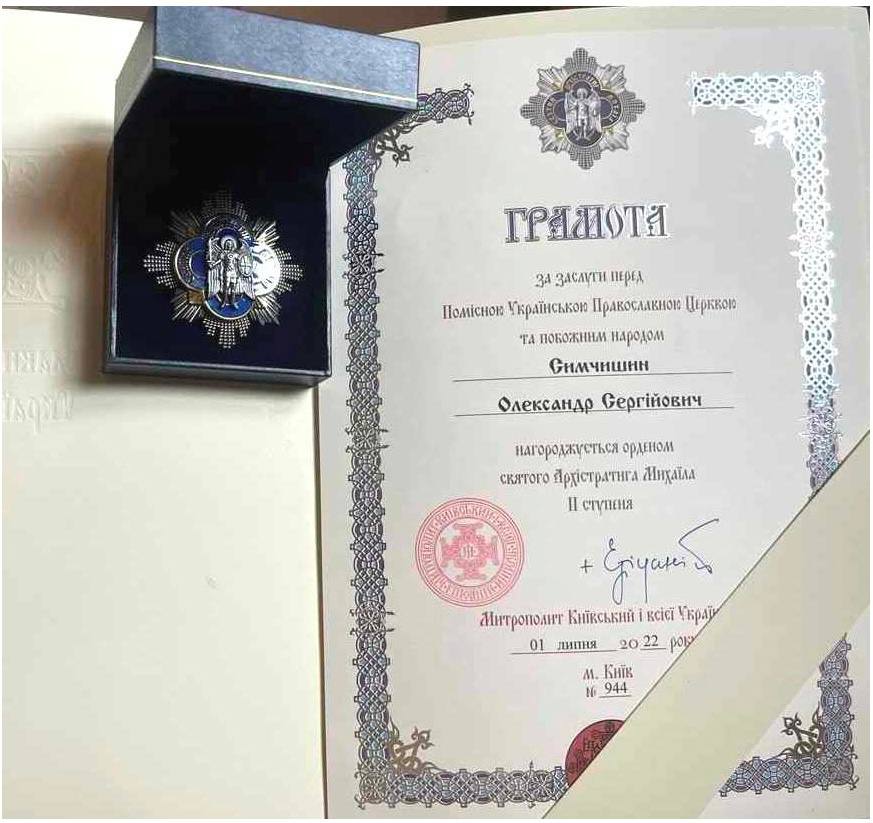 Меру Хмельницького Олександру Симчишину вручили орден Архистратига Михаїла ІІ ступеню. У грамоті, фото якої опублікував міський голова, йдеться, що його вручили “за заслуги перед Помісною Українською Православною Церквою та побожним народом”.
