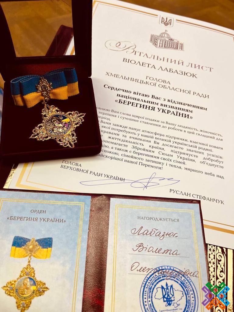 Орденом «Берегиня України» нагородили голову Хмельницької обласної ради Віолету Лабазюк. Відзнака - народна. Її вручають жінкам України за особистий внесок у розвиток країни та вірність нації.