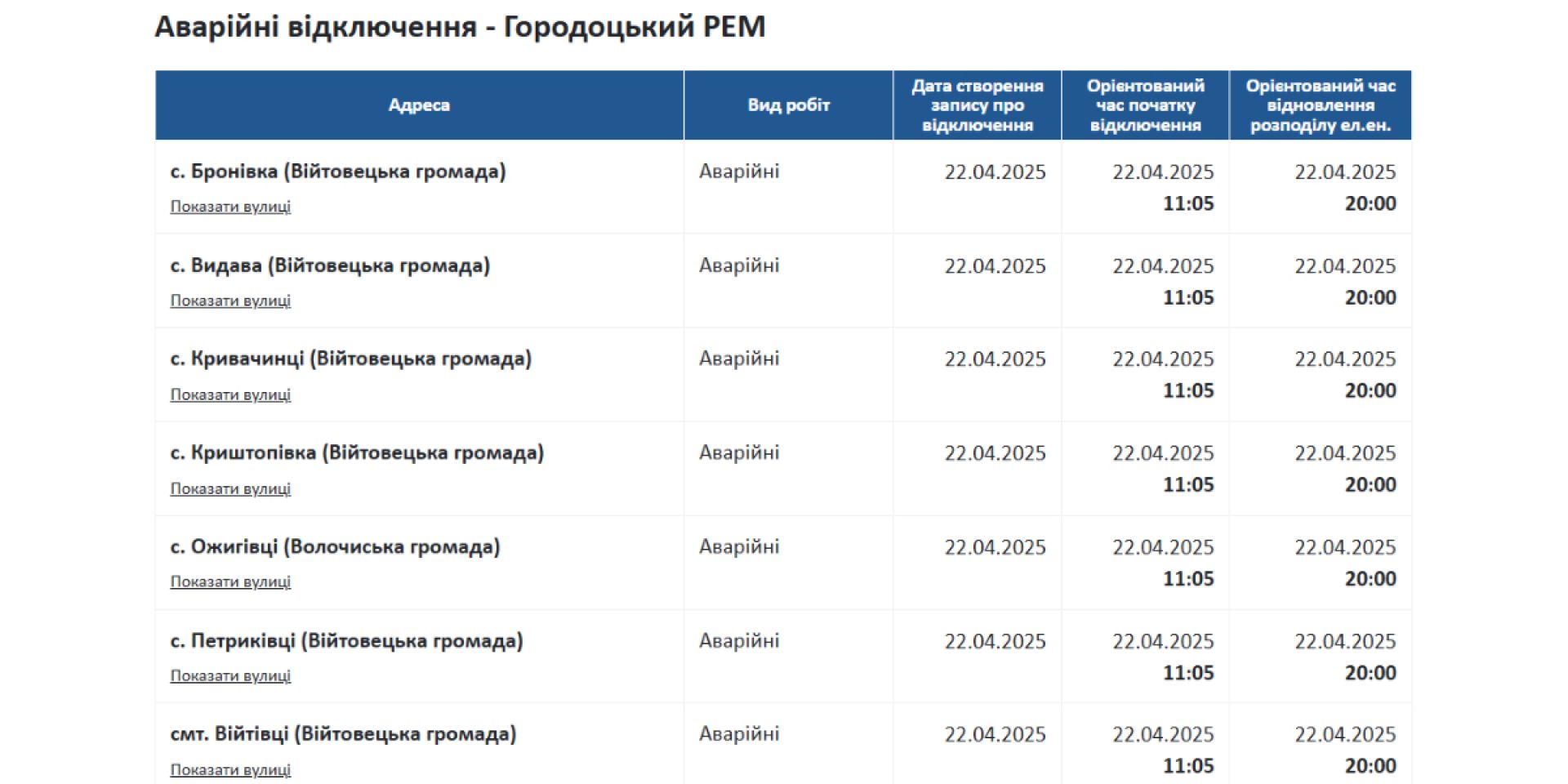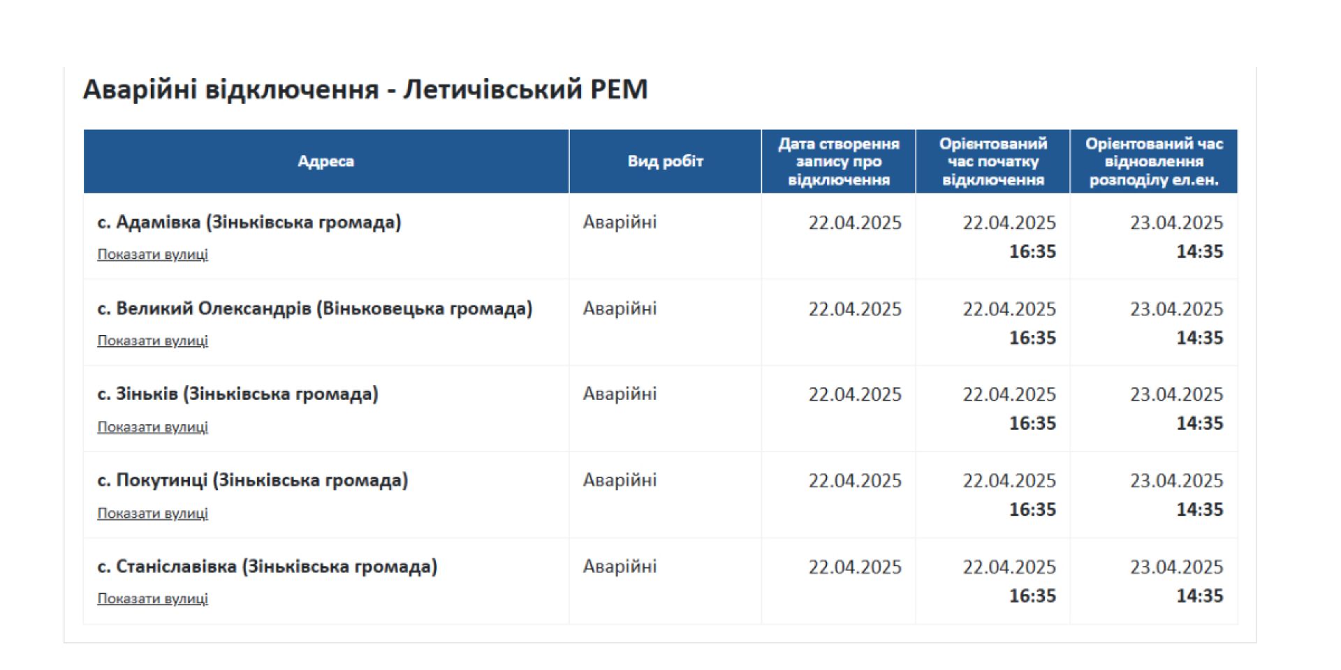 Водночас на офіційному сайті АТ "Хмельницькобленерго" повідомили, що з 11:05 у деяких населених пунктах Хмельницького району зафіксовано аварійне відключення електроенергії. Компанія опублікувала список адрес, що потрапили під аварійне знеструмлення, та зазначила орієнтовний час відновлення електропостачання.