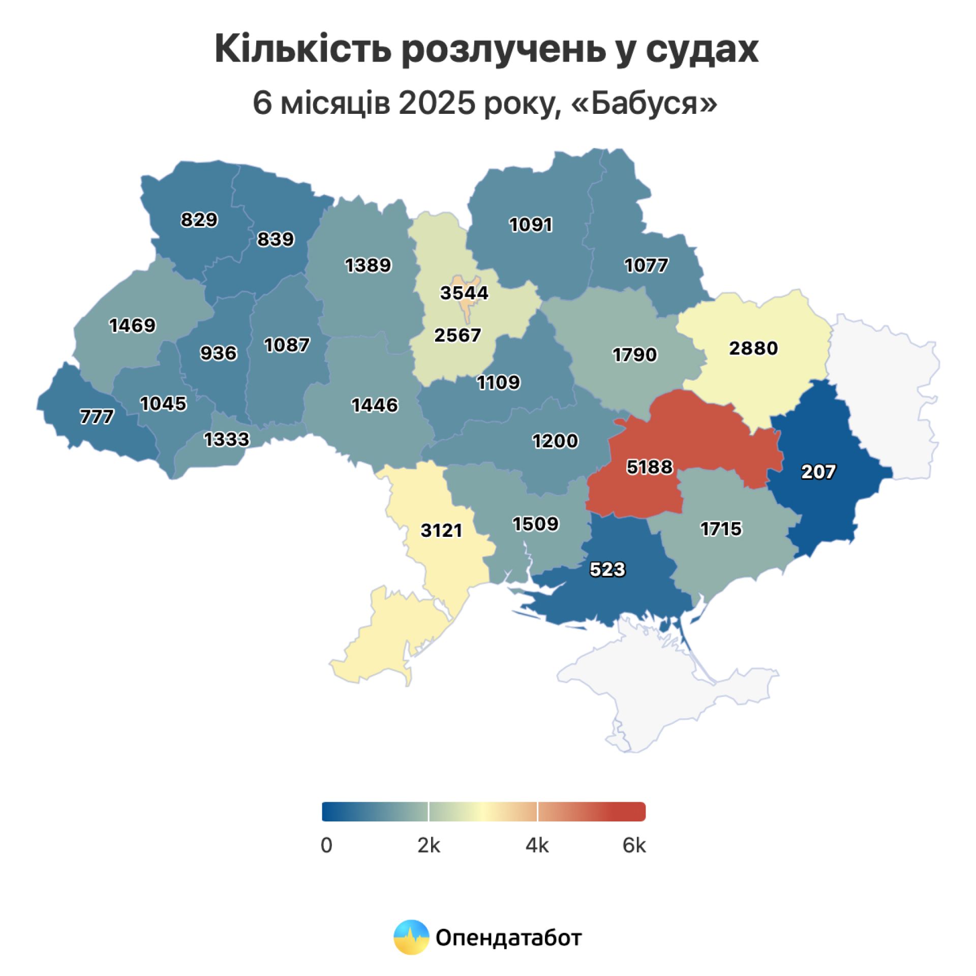 Абсолютним лідером за кількістю розлучень у судах стала Дніпропетровська область — тут за пів року розлучилося 5 188 пар, що становить 13% від усіх судових рішень.