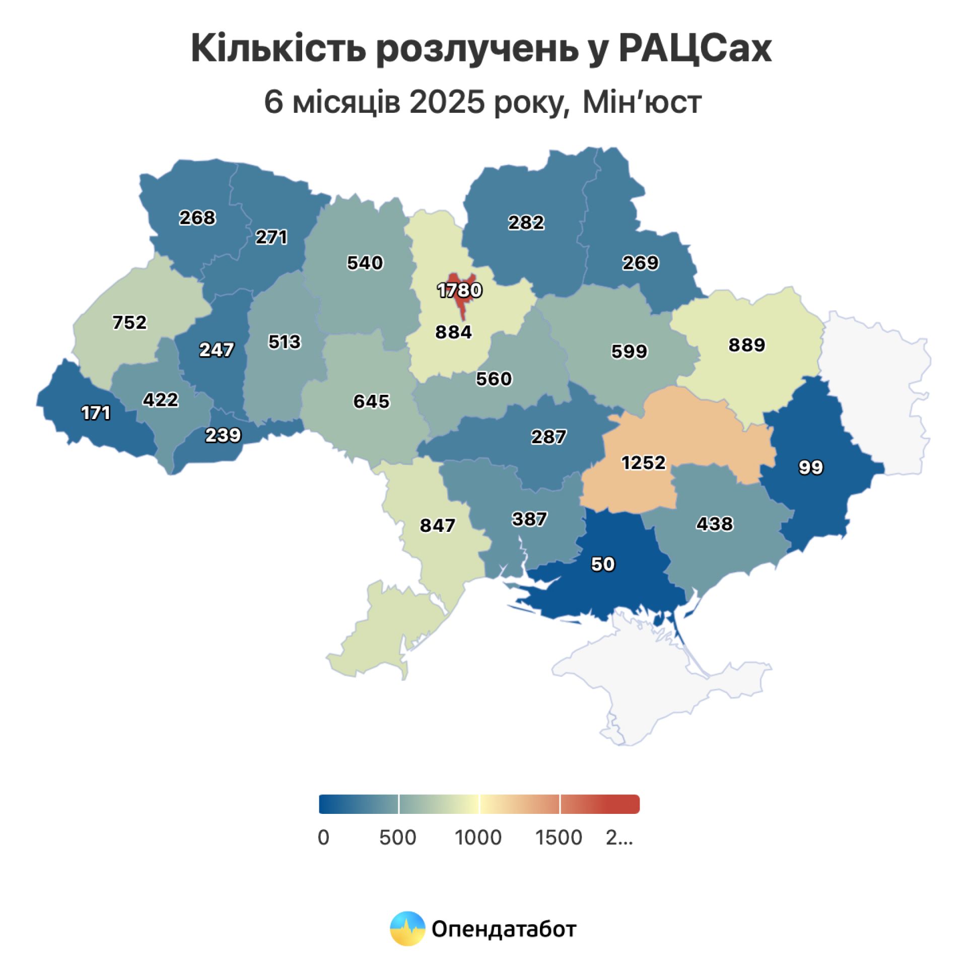 Для порівняння: у РАЦСах за той самий період було розірвано 12 691 шлюб. Найбільше розлучень зареєстрували в Києві (1 780), Дніпропетровській області (1 252) та Харківській області (889).